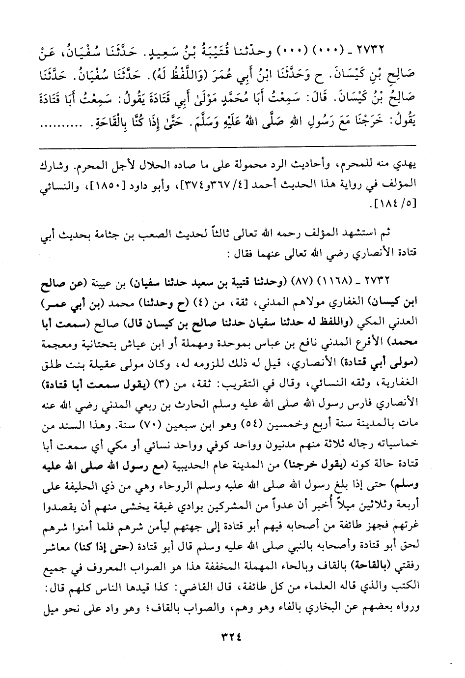 ٢٧٣٢ - (١١٦٨) (٨٧) (وحدثنا قتيبة بن سعيد حدثنا سفيان) بن عيينة (عن صالح بن كيسان) الغفاري مولاهم المدني، ثقة، من (٤) (ح وحدثنا) محمد (بن أبي عمر) العدني المكي (واللفظ له حدثنا سفيان حدثنا صالح بن كيسان قال) صالح (سمعت أبا محمد) الأقرع المدني نافع بن عباس بموحدة ومهملة أو ابن عياش بتحتانية ومعجمة (مولى أبي قتادة) الأنصاري، قيل له ذلك للزومه له، وكان مولى عقيلة بنت طلق الغفارية، وثقه النسائي، وقال في التقريب: ثقة، من (٣) (يقول سمعت أبا قتادة) الأنصاري فارس رسول الله صلى الله عليه وسلم الحارث بن ربعي المدني رضي الله عنه مات بالمدينة سنة أربع وخمسين (٥٤) وهو ابن سبعين (٧٠) سنة. وهذا السند من خماسياته رجاله ثلاثة منهم مدنيون وواحد كوفي وواحد نسائي أو مكي أي سمعت أبا قتادة حالة كونه (يقول خرجنا) من المدينة عام الحديبية (مع رسول الله صلى الله عليه وسلم) حتى إذا بلغ رسول الله صلى الله عليه وسلم الروحاء وهي من ذي الحليفة على أربعة وثلاثين ميلًا أُخبر أن عدوًا من المشركين بوادي غيقة يخشى منهم أن يقصدوا غرتهم فجهز طائفة من أصحابه فيهم أبو قتادة إلى جهتهم ليأمن شرهم فلما أمنوا شرهم لحق أبو قتادة وأصحابه بالنبي صلى الله عليه وسلم قال أبو قتادة (حتى إذا كنا) معاشر رفقتي (بالقاحة) بالقاف وبالحاء المهملة المخففة هذا هو الصواب المعروف في جميع الكتب والذي قاله العلماء من كل طائفة، قال القاضي: كذا قيدها الناس كلهم قال: ورواه بعضهم عن البخاري بالفاء وهو وهم، والصواب بالقاف؛ وهو واد على نحو ميل