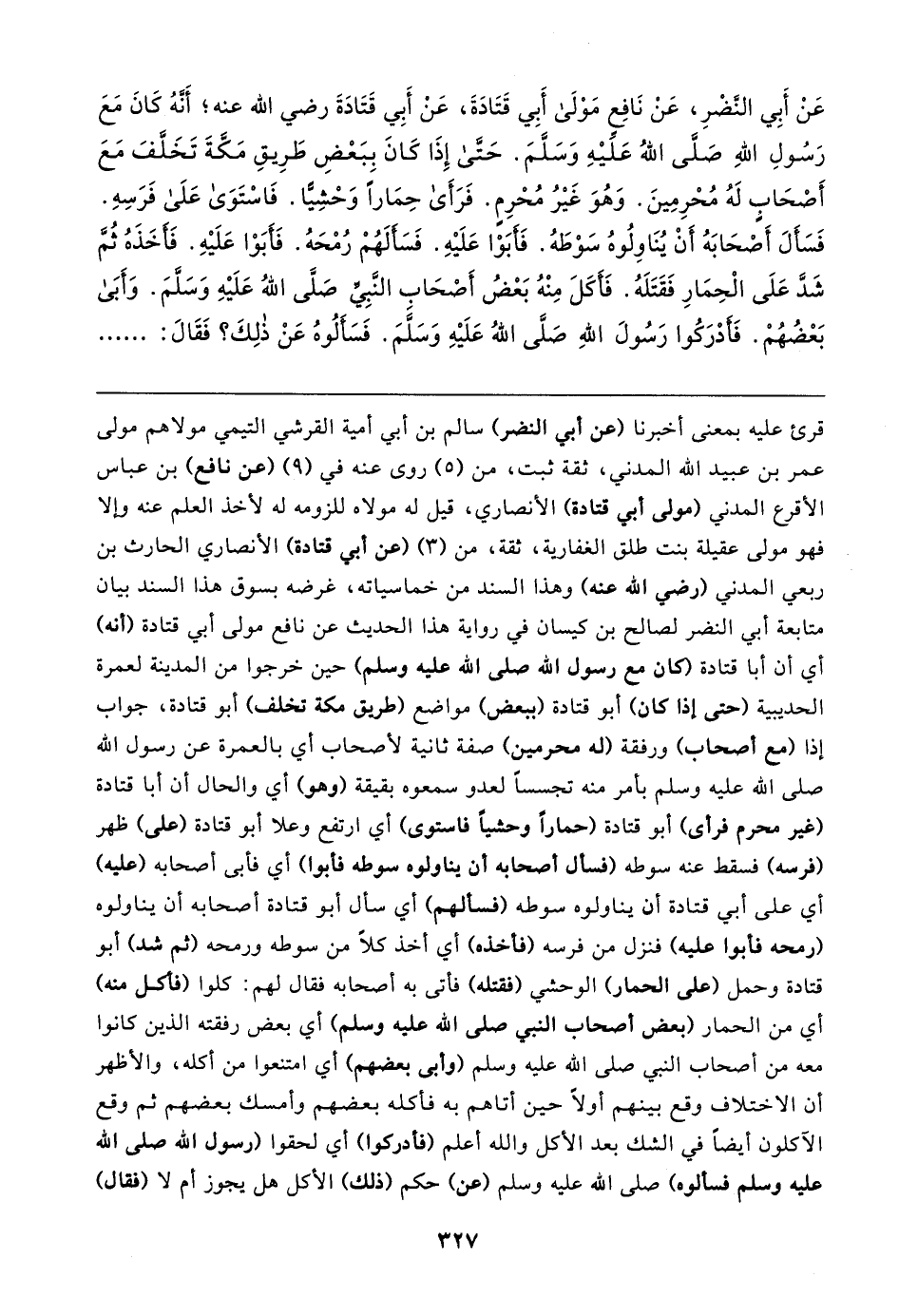 عَنْ أَبِي النَّضْرِ، عَنْ نَافِعٍ مَوْلَى أَبِي قَتَادَةَ، عَنْ أَبِي قَتَادَةَ رضي الله عنه؛ أَنَّهُ كَانَ مَعَ رَسُولِ اللهِ صَلَّى اللهُ عَلَيهِ وَسَلَّمَ. حَتَّى إِذَا كَانَ بِبَعْضِ طَرِيقِ مَكَّةَ تَخَلَّفَ مَعَ أَصْحَابٍ لَهُ مُحْرِمِينَ. وَهُوَ غَيرُ مُحْرِمٍ. فَرَأَى حِمَارًا وَحْشِيًا. فَاسْتَوَى عَلَى فَرَسِهِ. فَسَألَ أَصْحَابَهُ أَنْ يُنَاولُوهُ سَوْطَهُ. فَأَبَوْا عَلَيهِ. فَسَأَلَهُمْ رُمْحَهُ. فَأَبَوْا عَلَيهِ. فَأَخَذَهُ ثُمَّ شَدَّ عَلَى الْحِمَارِ فَقَتَلَهُ. فَأكَلَ مِنْهُ بَعْضُ أَصْحَاب النَّبِيِّ صَلَّى اللهُ عَلَيهِ وَسَلَّمَ. وَأَبَى بَعْضُهُمْ. فَأدْرَكُوا رَسُولَ اللهِ صَلَّى اللهُ عَلَيهِ وَسَلًّمَ. فَسَألُوهُ عَنْ ذلِكَ؟ فَقَال: