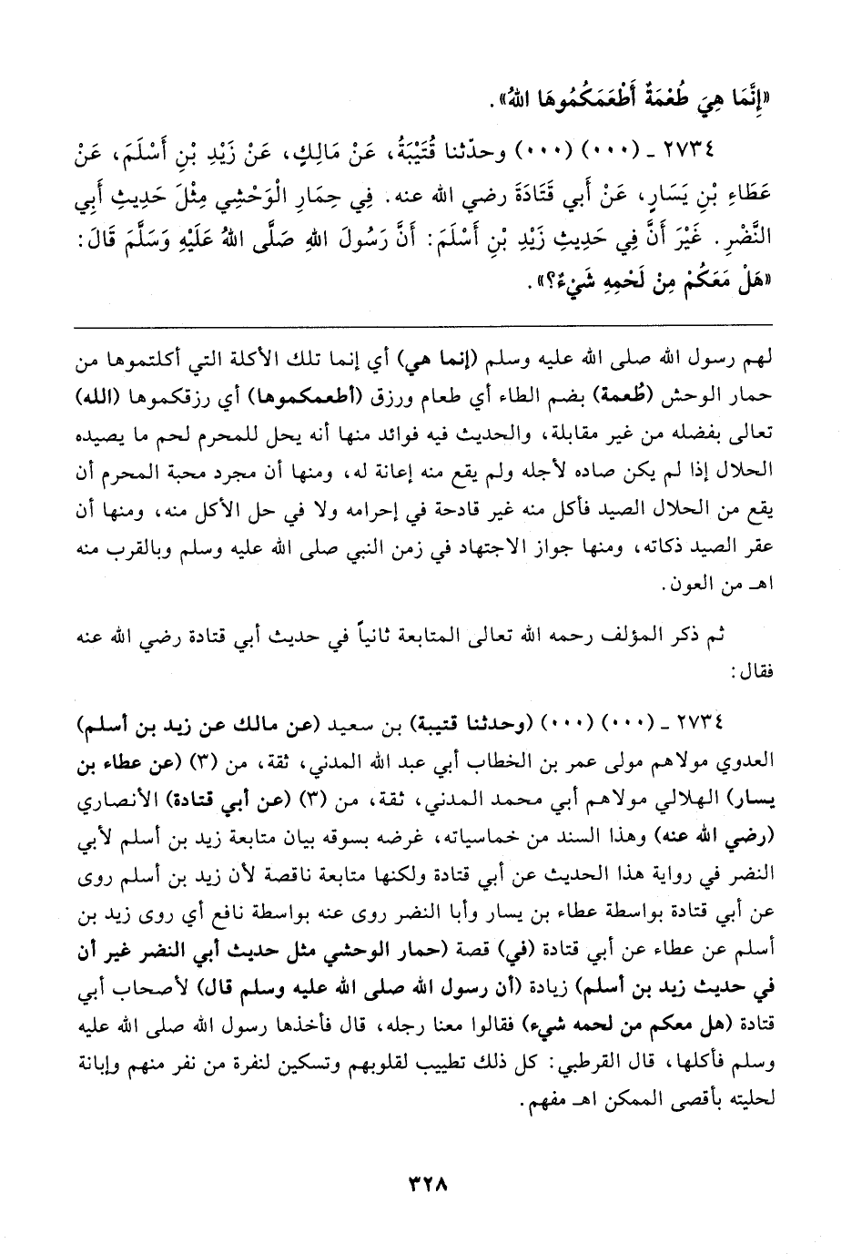 ٢٧٣٤ - (٠٠) (٠٠) (وحدثنا قتيبة) بن سعيد (عن مالك عن زيد بن أسلم) العدوي مولاهم مولى عمر بن الخطاب أبي عبد الله المدني، ثقة، من (٣) (عن عطاء بن يسار) الهلالي مولاهم أبي محمد المدني، ثقة، من (٣) (عن أبي قتادة) الأنصاري (رضي الله عنه) وهذا السند من خماسياته، غرضه بسوقه بيان متابعة زيد بن أسلم لأبي النضر في رواية هذا الحديث عن أبي قتادة ولكنها متابعة ناقصة لأن زيد بن أسلم روى عن أبي قتادة بواسطة عطاء بن يسار وأبا النضر روى عنه بواسطة نافع أي روى زيد بن أسلم عن عطاء عن أبي قتادة (في) قصة (حمار الوحشي مثل حديث أبي النضر غير أن في حديث زيد بن أسلم) زيادة (أن رسول الله صلى الله عليه وسلم قال) لأصحاب أبي قتادة (هل معكم من لحمه شيء) فقالوا معنا رجله، قال فأخذها رسول الله صلى الله عليه وسلم فأكلها، قال القرطبي: كل ذلك تطييب لقلوبهم وتسكين لنفرة من نفر منهم وإبانة لحليته بأقصى الممكن اهـ مفهم.