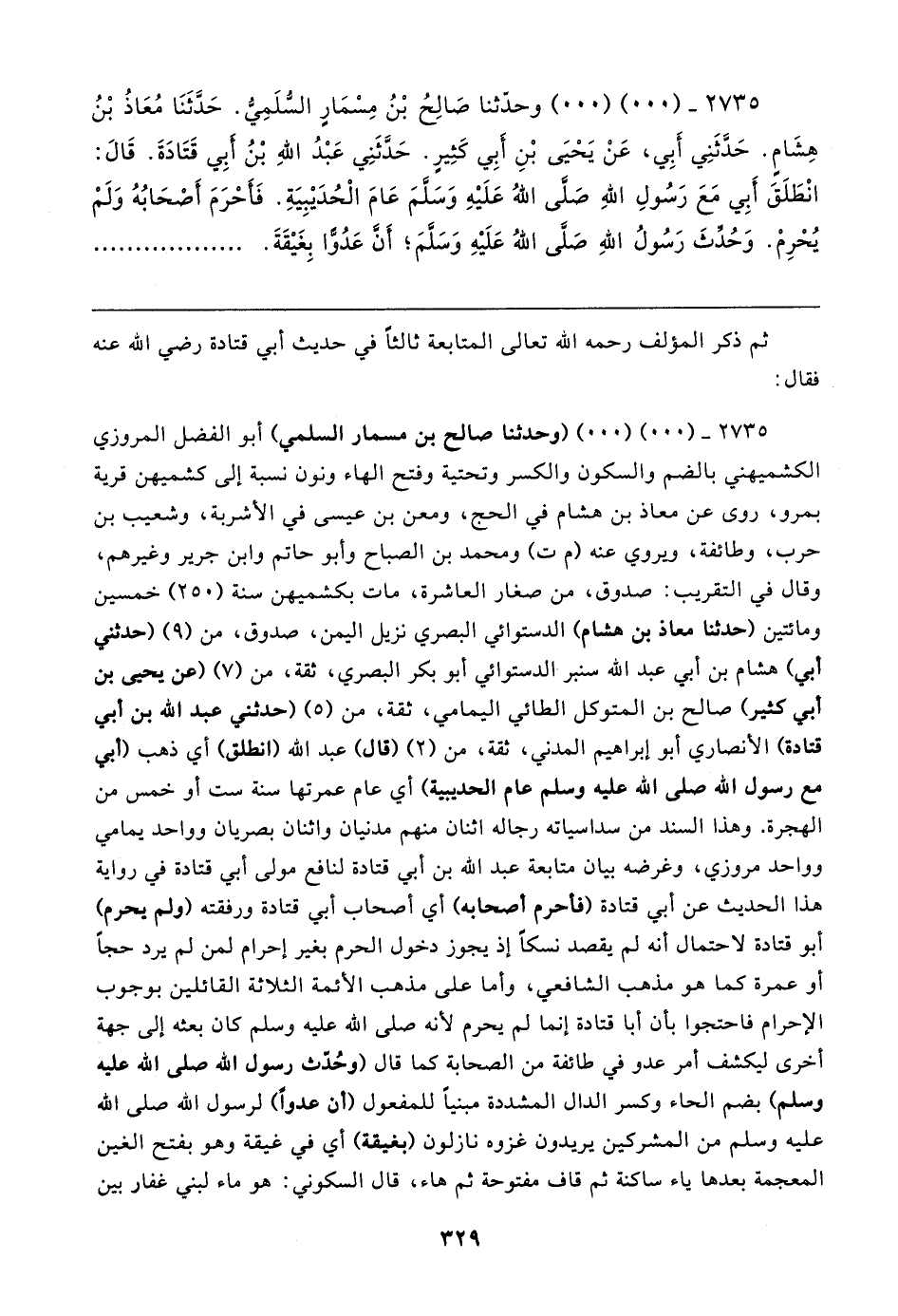 ٢٧٣٥ - (٠٠) (٠٠) وحدّثنا صَالِحُ بْنُ مِسْمَارٍ السُّلَمِيُّ. حَدَّثَنَا مُعَاذُ بْنُ هِشَامٍ. حَدَّثَنِي أَبِي، عَنْ يَحْيَى بْنِ أَبِي كَثِيرٍ. حَدَّثَنِي عَبْدُ اللهِ بْنُ أَبِي قَتَادَةَ. قَال: انْطَلَقَ أَبِي مَعَ رَسُولِ اللهِ صَلَّى اللهُ عَلَيهِ وَسَلَّمَ عَامَ الْحُدَيبِيَةِ. فَأَحْرَمَ أَصْحَابُهُ وَلَمْ يُحْرِمْ. وَحُدِّثَ رَسُولُ اللهِ صَلَّى اللهُ عَلَيهِ وَسَلَّمَ؛ أَنَّ عَدُوًّا بِغَيقَةَ