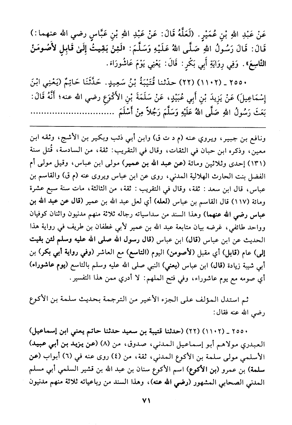 ٢٥٥٠ - (١١٠٢) (٢٢) (حدثنا قتيبة بن سعيد حدثنا حاتم يعني ابن إسماعيل) العبدري مولاهم أبو إسماعيل المدني، صدوق، من (٨) (عن يزيد بن أبي عبيد) الأسلمي مولى سلمة بن الأكوع المدني، ثقة، من (٤) روى عنه في (٦) أبواب (عن سلمة) بن عمرو (بن الأكوع) اسم الأكوع سنان بن عبد الله بن قشير السلمي أبي مسلم المدني الصحابي المشهور (رضي الله عنه)، وهذا السند من رباعياته ثلاثة منهم مدنيون