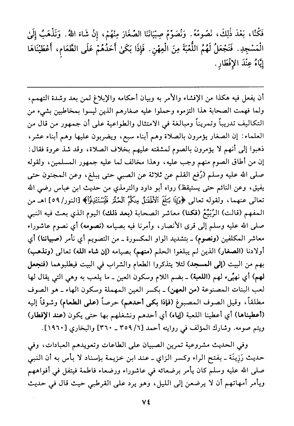 فَكُنَّا، بَعْدَ ذلِكَ، نَصُومُهُ. وَنُصَوِّمُ صِبْيَانَنَا الصِّغَارَ مِنْهُمْ، إِنْ شَاءَ اللهُ. وَنَذْهَبُ إِلَى الْمَسْجِدِ. فَنَجْعَلُ لَهُمُ اللُّعْبَةَ مِنَ الْعِهْنِ. فَإِذَا بَكَى أَحَدُهُمْ عَلَى الطَّعَامِ، أعْطَينَاهَا إِيَّاهُ عِنْدَ الإِفْطَارِ،
