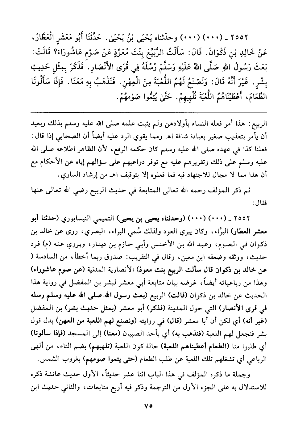 ٢٥٥٢ - (٠٠) (٠٠) وحدَّثناه يَحْيَى بْنُ يَحْيَى. حَدَّثَنَا أبُو مَعْشَرٍ الْعَطَّارُ، عَنْ خَالِدِ بْنِ ذَكْوَانَ. قَال: سَأَلْتُ الرُّبَيِّعَ بِنْتَ مُعَوِّذٍ عَنْ صَوْمِ عَاشُورَاءَ؟ قَالتْ: بَعَثَ رَسُولُ اللهِ صَلى اللهُ عَلَيهِ وَسَلَّمَ رُسُلَهُ فِي قُرَى الأنْصَارِ. فَذَكَرَ بِمِثْلِ حَدِيثِ بِشْرٍ. غَيرَ أَنَّهُ قَال: وَنَصْنَعُ لَهُمُ اللُّعْبَةَ مِنَ الْعِهْنِ. فَنَذْهَبُ بِهِ مَعَنَا. فَإِذَا سَأَلُونَا الطَّعَامَ، أَعْطَينَاهُمُ اللُّعْبَةَ تُلْهِيهِمْ. حَتَّى يُتِمُّوا صَوْمهُمْ