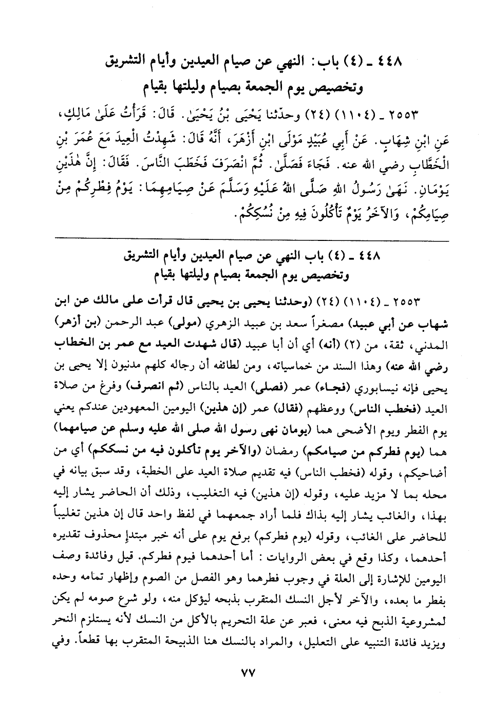 ٤٤٨ - (٤) باب النهي عن صيام العيدين وأيام التشريق وتخصيص يوم الجمعة بصيام وليلتها بقيام