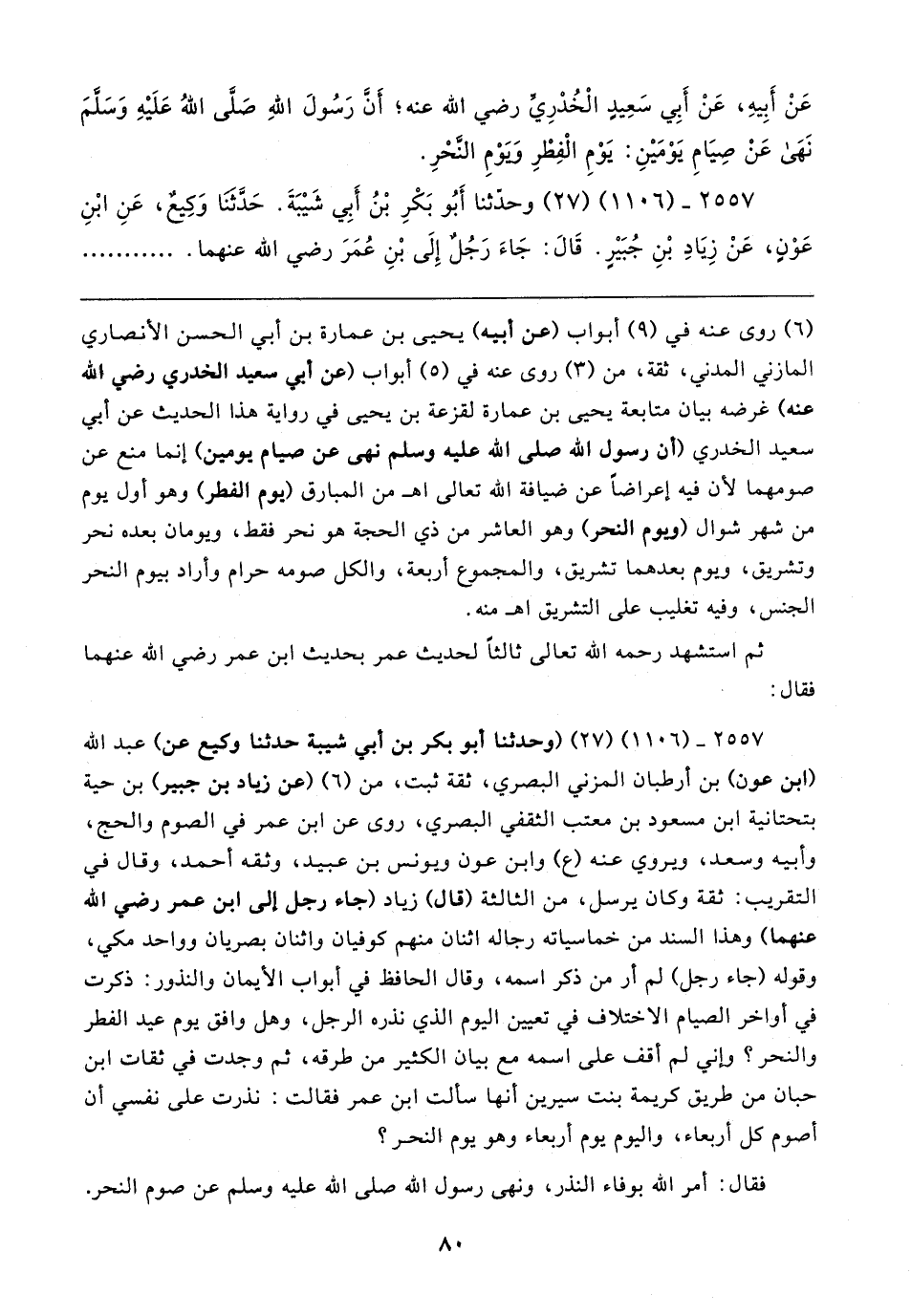 ٢٥٥٧ - (١١٠٦) (٢٧) (وحدثنا أبو بكر بن أبي شيبة حدثنا وكيع عن) عبد الله (ابن عون) بن أرطبان المزني البصري، ثقة ثبت، من (٦) (عن زياد بن جبير) بن حية بتحتانية ابن مسعود بن معتب الثقفي البصري، روى عن ابن عمر في الصوم والحج، وأبيه وسعد، ويروي عنه (ع) وابن عون ويونس بن عبيد، وثقه أحمد، وقال في التقريب: ثقة وكان يرسل، من الثالثة (قال) زياد (جاء رجل إلى ابن عمر رضي الله عنهما) وهذا السند من خماسياته رجاله اثنان منهم كوفيان واثنان بصريان وواحد مكي، وقوله (جاء رجل) لم أر من ذكر اسمه، وقال الحافظ في أبواب الأيمان والنذور: ذكرت في أواخر الصيام الاختلاف في تعيين اليوم الذي نذره الرجل، وهل وافق يوم عيد الفطر والنحر؛ دماني لم أقف على اسمه مع بيان الكثير من طرقه، ثم وجدت في ثقات ابن حبان من طريق كريمة بنت سيرين أنها سألت ابن عمر فقالت: نذرت على نفسي أن أصوم كل أربعاء، واليوم يوم أريعاء وهو يوم النحر؟