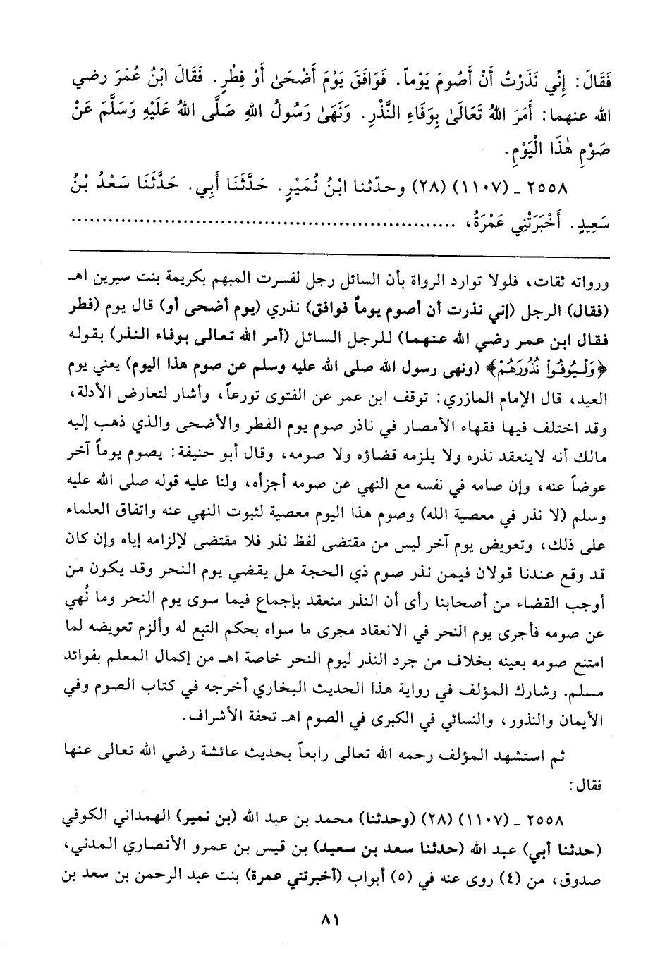 ورواته ثقات، فلولا توارد الرواة بأن السائل رجل لفسرت المبهم بكريمة بنت سيرين اهـ (فقال) الرجل (إني نذرت أن أصوم يومًا فوافق) نذري (يوم أضحى أو) قال يوم (فطر فقال ابن عمر رضي الله عنهما) للرجل السائل (أمر الله تعالى بوفاء النذر) بقوله {وَلْيُوفُوا نُذُورَهُمْ} (ونهى رسول الله صلى الله عليه وسلم عن صوم هذا اليوم) يعني يوم العيد، قال الإمام المازري: توقف ابن عمر عن الفتوى تورعًا، وأشار لتعارض الأدلة، وقد اختلف فيها فقهاء الأمصار في ناذر صوم يوم الفطر والأضحى والذي ذهب إليه مالك أنه لا ينعقد نذره ولا يلزمه قضاؤه ولا صومه، وقال أبو حنيفة: يصوم يومًا آخر عوضًا عنه، وإن صامه في نفسه مع النهي عن صومه أجزأه، ولنا عليه قوله صلى الله عليه وسلم (لا نذر في معصية الله) وصوم هذا اليوم معصية لثبوت النهي عنه واتفاق العلماء على ذلك، وتعويض يوم آخر ليس من مقتضى لفظ نذر فلا مقتضى لإلزامه إياه وإن كان قد وقع عندنا قولان فيمن نذر صوم ذي الحجة هل يقضي يوم النحر وقد يكون من أوجب القضاء من أصحابنا رأى أن النذر منعقد بإجماع فيما سوى يوم النحر وما نُهي عن صومه فأجرى يوم النحر في الانعقاد مجرى ما سواه بحكم التبع له وألزم تعويضه لما امتنع صومه بعينه بخلاف من جرد النذر ليوم النحر خاصة اهـ من إكمال المعلم بفوائد مسلم. وشارك المؤلف في رواية هذا الحديث البخاري أخرجه في كتاب الصوم وفي الإيمان والنذور، والنسائي في الكبرى في الصوم اهـ تحفة الأشراف.