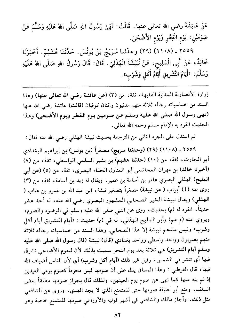 زرارة الأنصارية المدنية الفقيهة، ثقة، من (٣) (عن عائشة رضي الله تعالى عنها) وهذا السند من خماسياته رجاله ثلاثة منهم مدنيون واثنان كوفيان (قالت) عائشة رضي الله عنها (نهى رسول الله صلى الله عليه وسلم عن صومين يوم الفطر وبوم الأضحى) وهذا الحديث انفرد به الإمام مسلم رحمه الله تعالى.