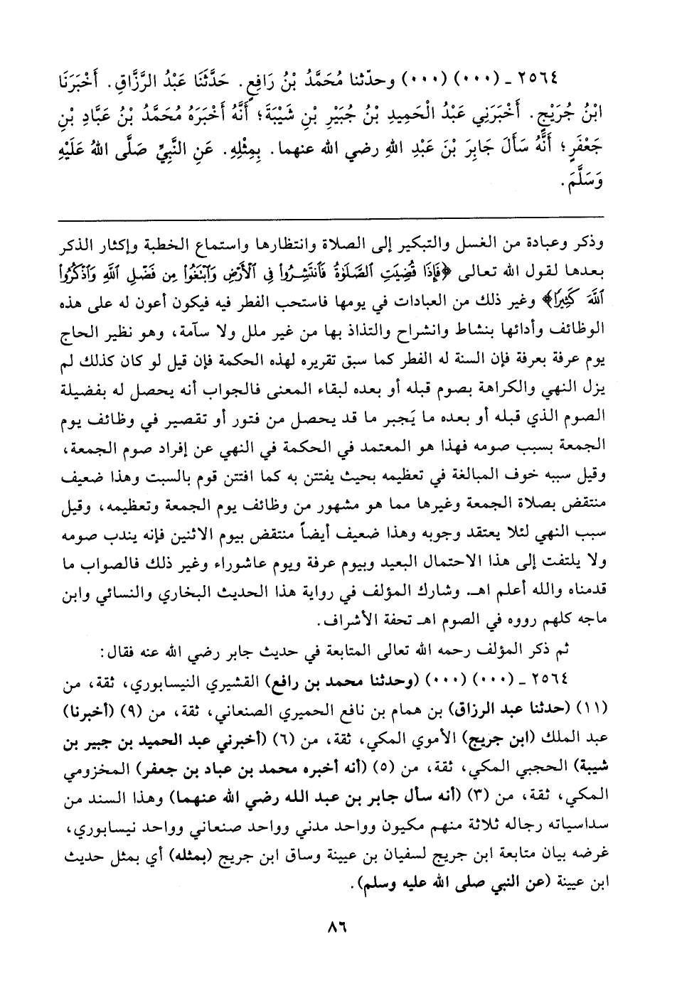 ٢٥٦٤ - (٠٠) (٠٠) (وحدثنا محمد بن رافع) القشيري النيسابوري، ثقة، من (١١) (حدثنا عبد الرزاق) بن همام بن نافع الحميري الصنعاني، ثقة، من (٩) (أخبرنا) عبد الملك (ابن جريج) الأموي المكي، ثقة، من (٦) (أخبرني عبد الحميد بن جبير بن شيبة) الحجبي المكي، ثقة، من (٥) (أنه أخبره محمد بن عباد بن جعفر) المخزومي المكي، ثقة، من (٣) (أنه سأل جابر بن عبد الله رضي الله عنهما) وهذا السند من سداسياته رجاله ثلاثة منهم مكيون وواحد مدني وواحد صنعاني وواحد نيسابوري، غرضه بيان متابعة ابن جريج لسفيان بن عيينة وساق ابن جريج (بمثله) أي بمثل حديث ابن عيينة (عن النبي صلى الله عليه وسلم).
