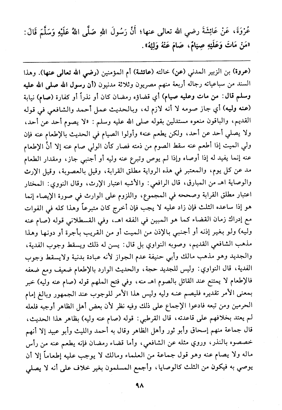 عُرْوَةَ، عَنْ عَائِشَةَ رضي الله تعالى عنها؛ أَنَّ رَسُولَ اللهِ صَلَّى اللهُ عَلَيهِ وَسَلَّمَ قَال: "مَنْ مَاتَ وَعَلَيهِ صِيَامٌ، صَامَ عَنْهُ وَلِيُّهُ"