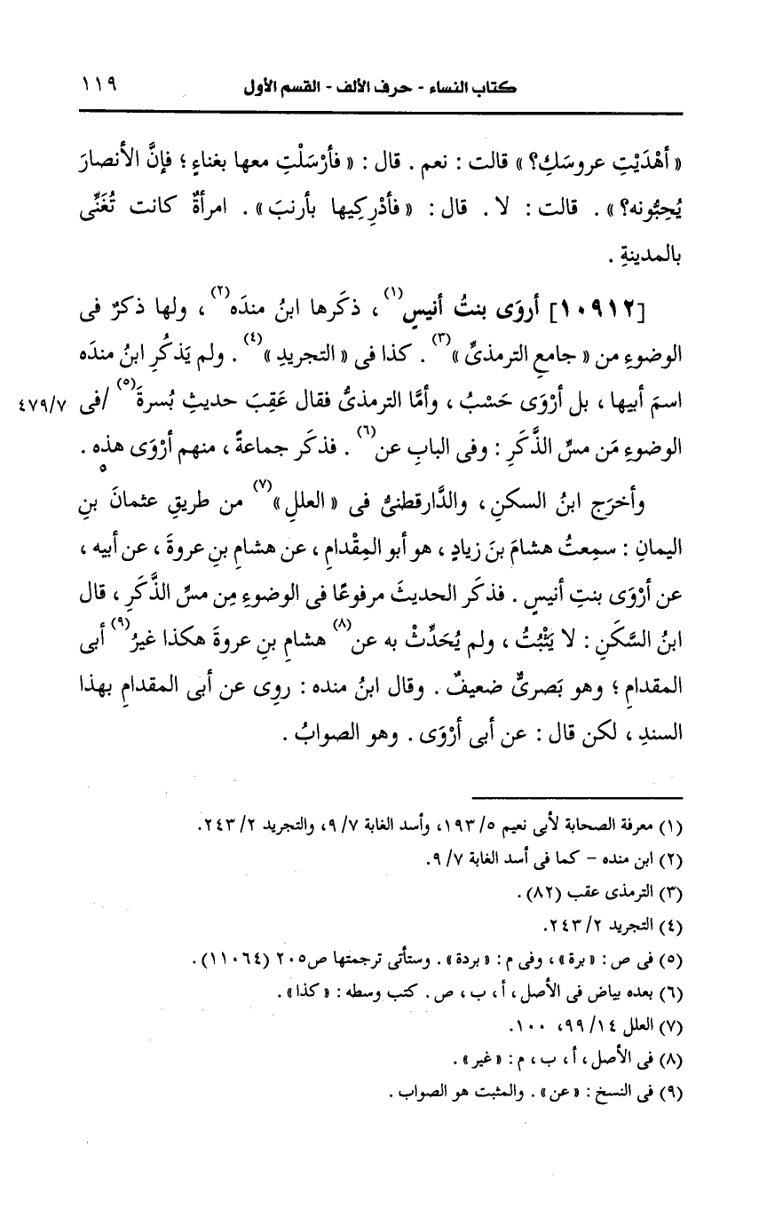 وقد ذكر جماعة منهم أروى هذه وأخرج بن السَّكَن والدارقطني في العلل من طريق عثمان بن اليمان سمعت هشام بن زياد هو أَبو المقدام، عَن هشام بن عُروَة، عَن أَبيه، عَن أروى بنت أنيس ...فذكر الحديث مَرْفُوعًا في الوضوء من مس الذكر.