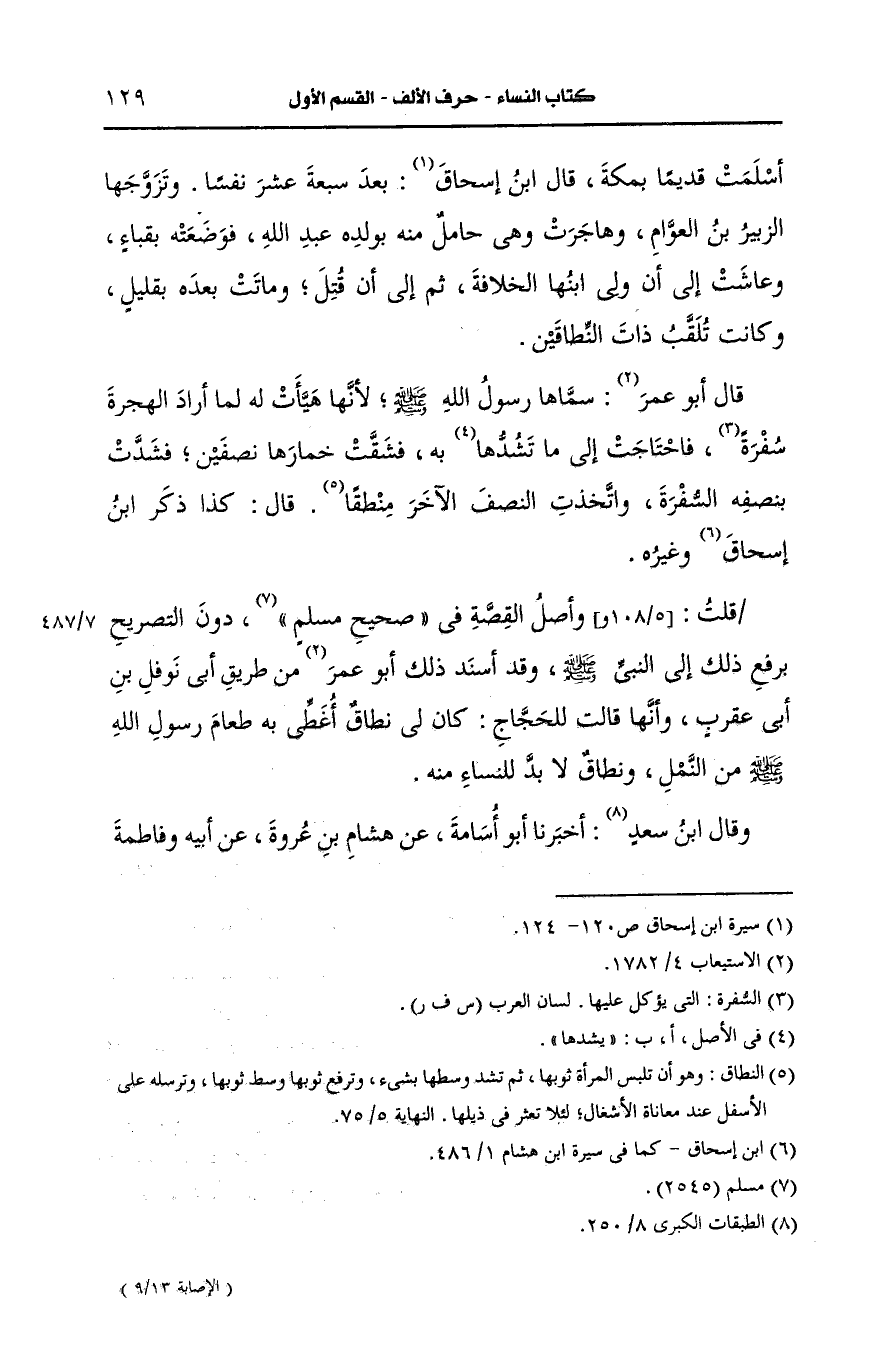 وقال ابنُ سَعْد أخبرنا أَبو أسامة، عَن هشام بن عُروَة، عَن أَبيه وفاطمة بنت المنذر، عَن أسماء قال صنعت سفرة للنبي صَلى الله عَلَيه وسَلم في بيت أبي بكر حين أراد أن يهاجر الى المدينة فلم نجد لسفرته ولا لسقائه ما نربطهما به فقلت لأبي بكر ما أجد إلا نطاقي قال شقيه باثنين فاربطي بواحد منهما السقاء وبالآخر السفرة وسنده صحيح.