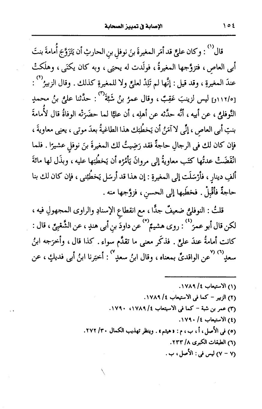 قلت: النوفلي ضعيف جدا مع انقطاع الإسناد والراوي مجهول فيه لكن قال أَبو عمر روى هيثم، عَن داود بن أبي هند، عَن الشعبي قال كانت أمامة عند علي فذكر معي ما تقدم سواء.