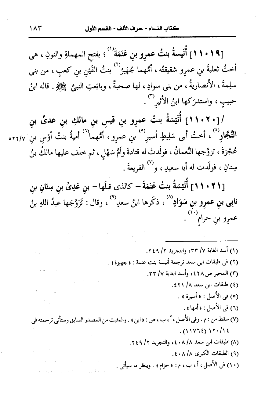 11020- أنيسة بنت عَمرو بن قيس بن مالك بن عَدِيّ بن النجار أخت أبي سليط أسيرة بن عمر وأمهما أمية بنت أوس بن عجرة.