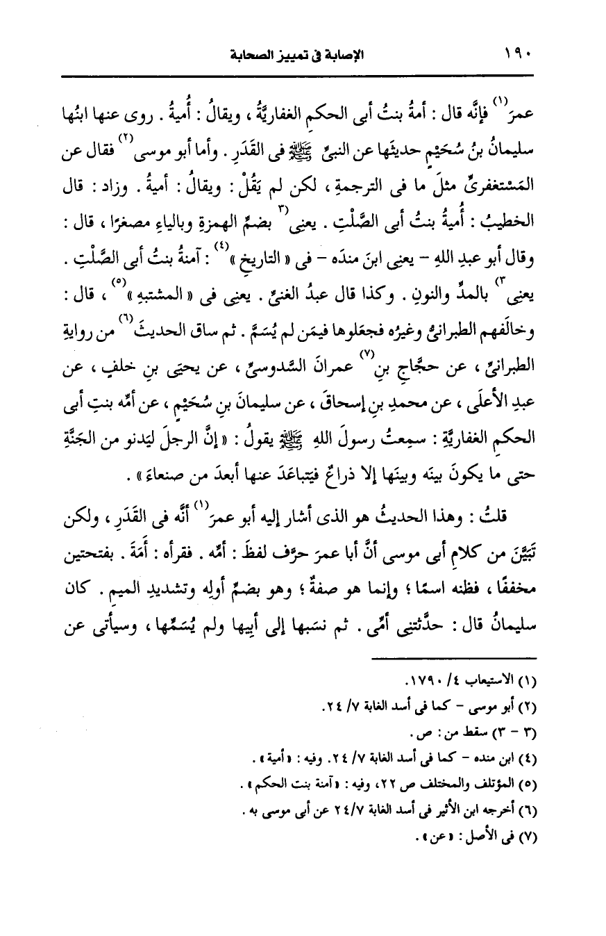 وأما أَبو موسى فقال، عَن المستغفري مثل ما في الترجمة لكن لم يقل، ويُقال: أمية وزاد قال الخطيب أمية بنت أبي الصلت يعني بضم الهمزة وبالياء مصغرا قال وقال أَبو عَبد الله يعني ابن مَنْدَه في التاريخ آمنة بنت أبي الصلت يعني بالمد والنون وكذا قال عبد الغني يعني في المشتبه قال وخالفهم الطبراني وغيره فجعلوها فيمن لم يسم ثم ساق الحديث من رواية الطبراني، عَن حجاج بن عمران السدوسي، عَن يحيى بن خلف، عَن عبد الأعلى، عَن محمد بن إسحاق، عَن سليمان بن سحيم، عَن أمه بنت أبي الحكم الغفارية سمعت رسول الله صَلى الله عَلَيه وسَلم يقول إن الرجل ليدنو من الجنة حتى ما يكون بينه وبينها إلا ذراع فيتباعد عنها أبعد من صنعاء".