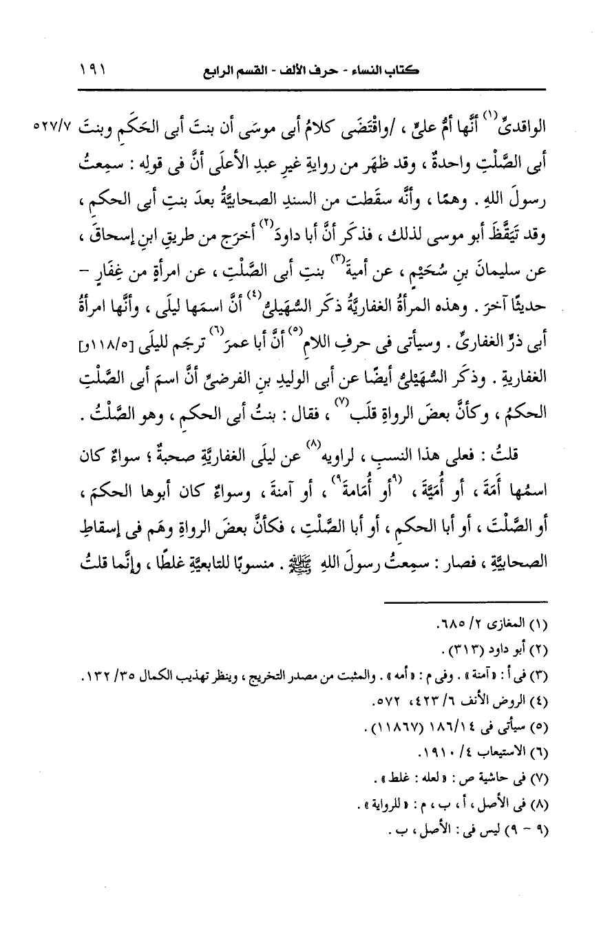 قلت: فعلى هذا النسب للرواية، عَن ليلى الغفارية لها صحبة سواء كان اسمها أمة أو أمية أو أمامة أو آمنة وسواء كان أبوها الحكم أو الصلت أو أبا الحكم أو أبا الصلت فكأن بعض الرواة وهم في إسقاط الصحابية فصار سمعت رسول الله صَلى الله عَلَيه وسَلم منسوبا للتابعية غلطا وإنما قلت: ذلك لأنه مخرج الحديث واحدة.