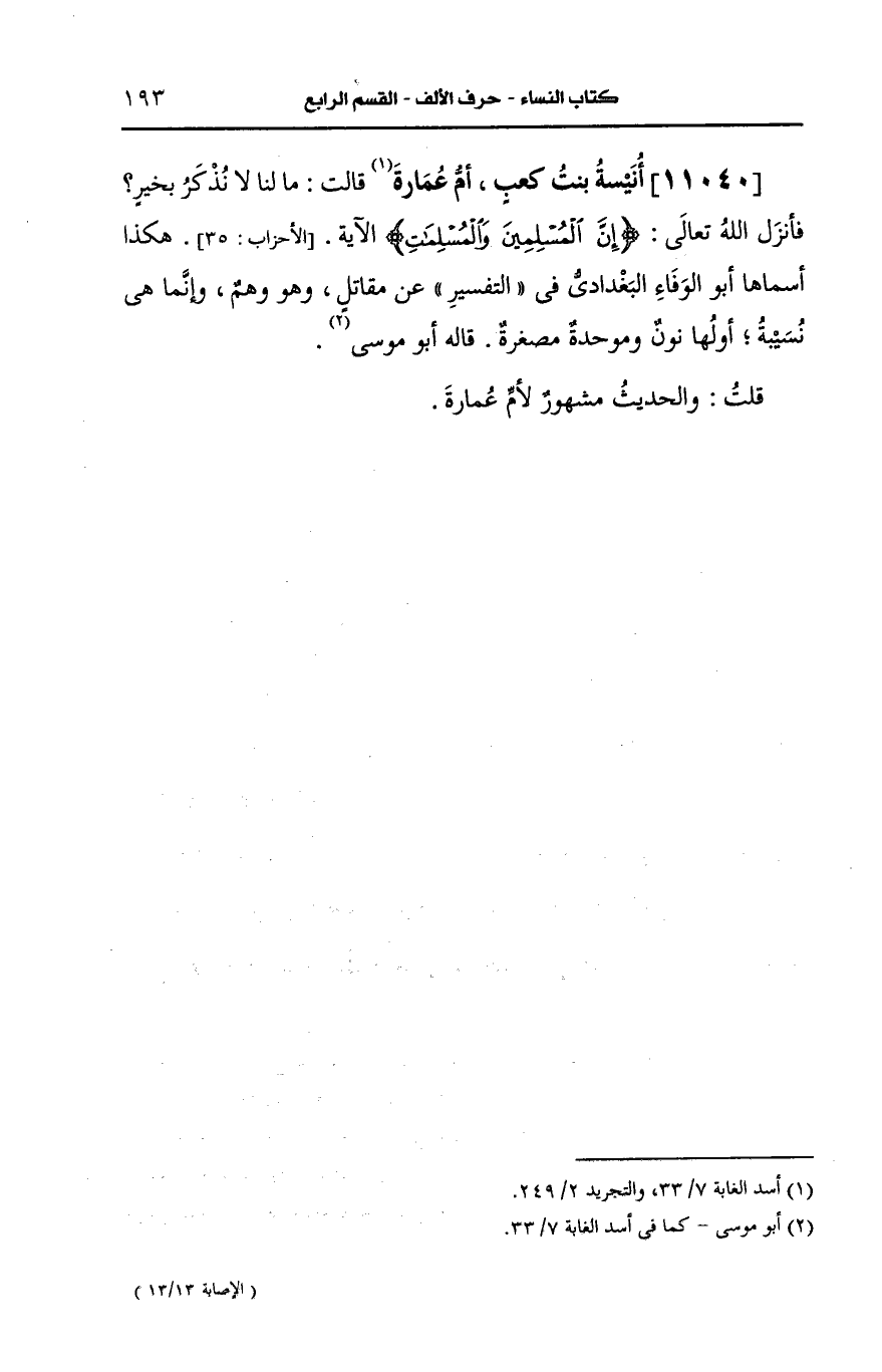 أم عمارة قالت ما لنا لا نذكر بخير فأنزل الله تعالى ?إن المسلمين والمسلمات? الآية هكذا اسماها أَبو الوفاء البغدادي في التفسير، عَن مقاتل وهو وهم وإنما هي نسيبة أولها نون وموحدة مصغرة قاله أَبو موسى: