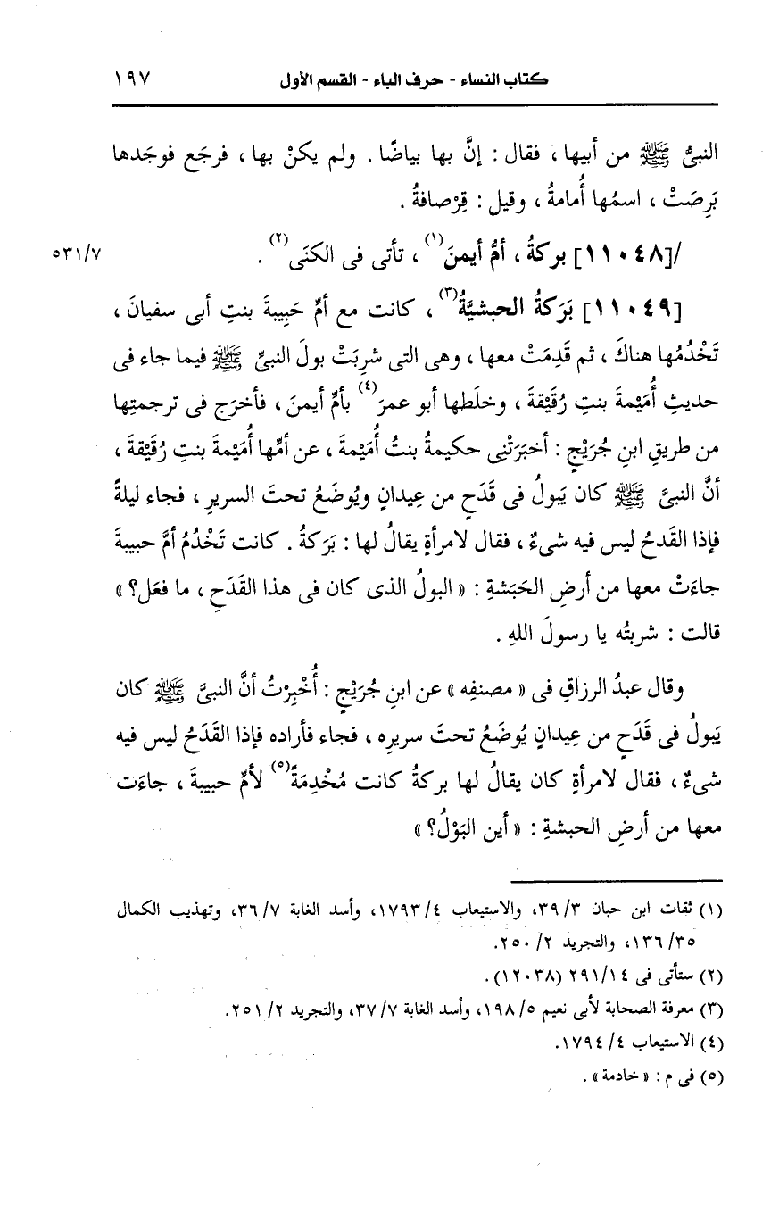 وسيأتي في ترجمة أم أيمن ما ذَكَرَهُ ابنُ السَّكَن أن كلا منهما كانت تكنى أم أيمن وتسمى بكرة ويتأيد ذلك بأن قصة البول وردت من طريق أخرى مروية لأم أيمن كما سأذكره في ترجمتها إن شاء الله تعالى.