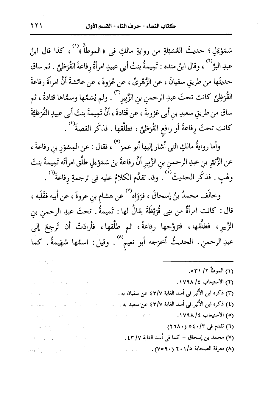 وقد تقدم الكلام عليه في ترجمة رفاعة وخالف محمد بن إسحاق فرواه، عَن هشام بن عُروَة، عَن أَبيه فقلبه قال كانت امرأة من بني قريظة يُقَالُ لَهَا: تميمة تحت عبد الرحمن بن الزبير فطلقها فتزوجها رفاعة ثم طلقها فأرادت أن ترجع إلى عبد الرحمن الحديث.