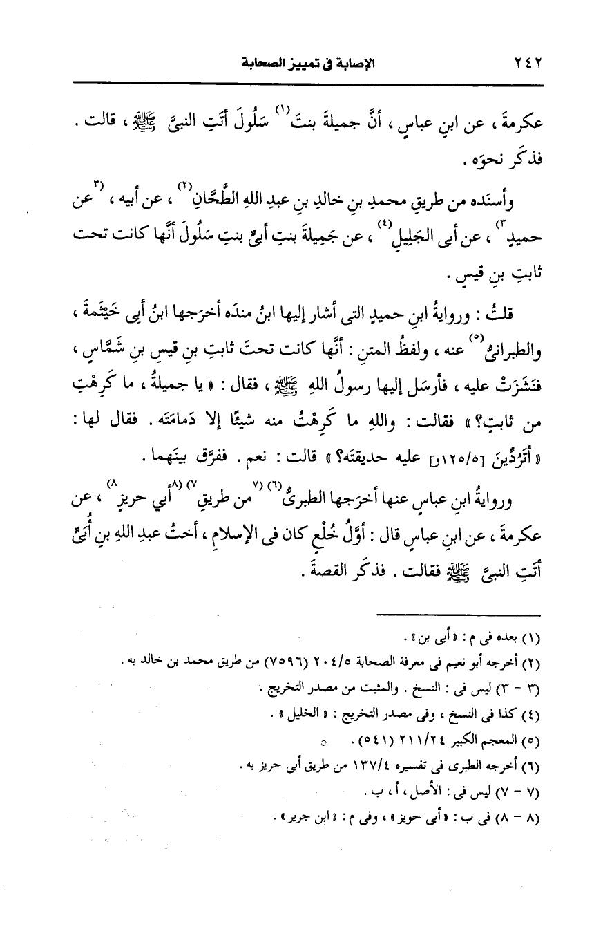 قلت: ورواية ابن حميد التي أشار إليها بن مندة أَخرجها بن أبي خيثمة والطبراني عنه ولفظ المتن أنها كانت تحت ثابت بن قيس بن شماس فنشزت عليه فأرسل إليها رسول الله صَلى الله عَلَيه وسَلم فقال يا جميلة ما كرهت من ثابت فقالت والله ما كرهت منه شيئا إلا دمامته فقال لها أتردين عليه حديقته قالت نعم ففرق بينهما.