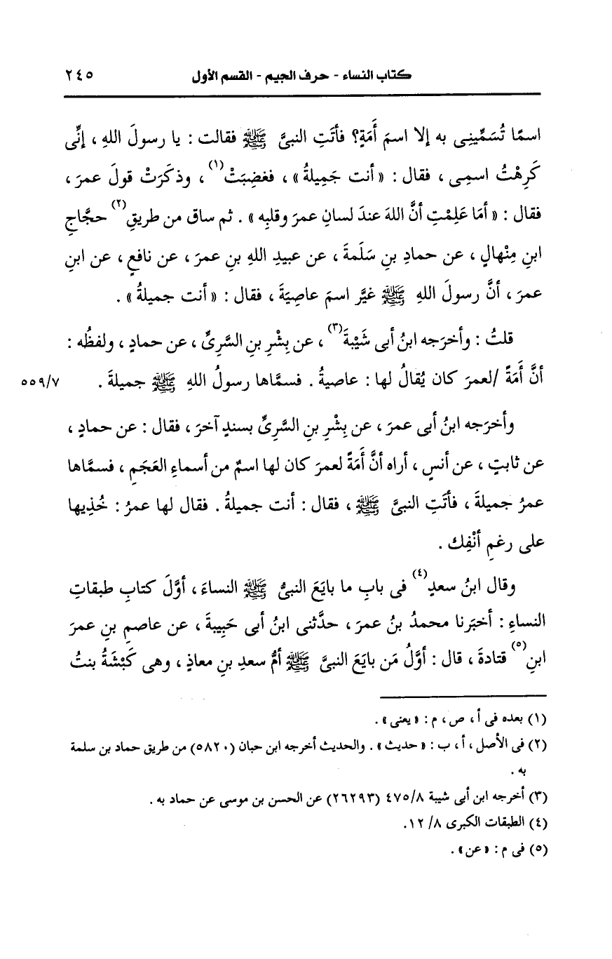 قلتُ: وَأَخرجَه بن أبي شيبة، عَن بشر بن السري، عَن حماد ولفظه أن أمة لعمر كان يُقَالُ لَهَا: عاصية فسماها رسول الله صَلى الله عَلَيه وسَلم جميلة.