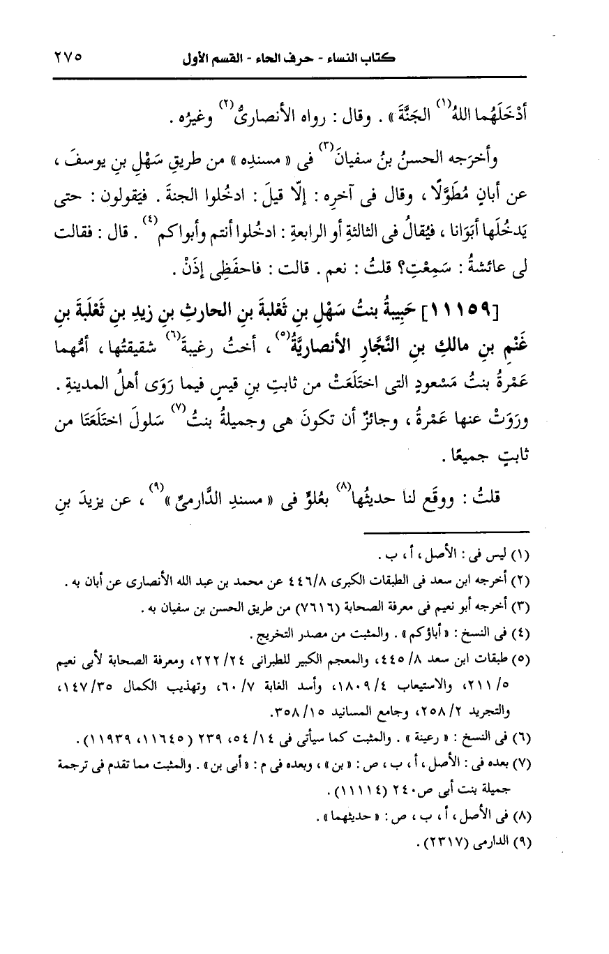 11159- حبيبة بنت سهل بن ثعلبة بن الحارث بن زيد بن ثعلبة بن غنم بن مالك بن النجار، الأَنصارِيّة.