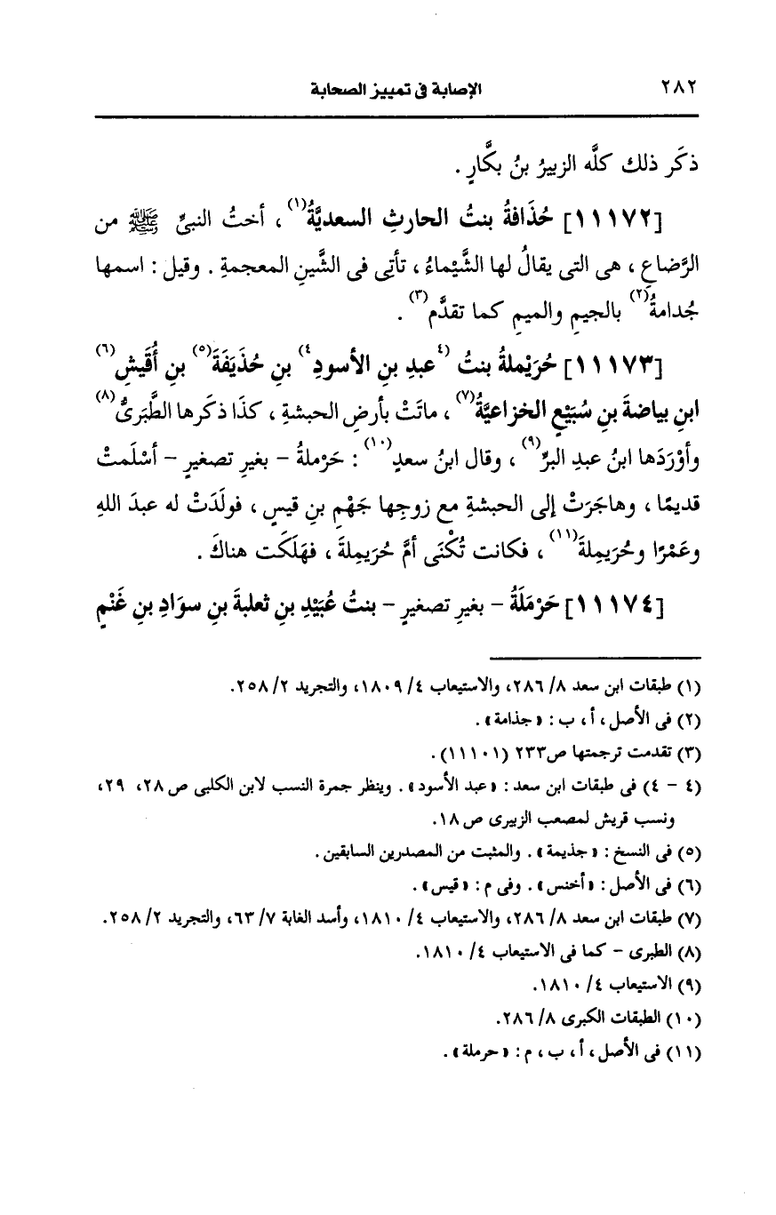 11173- حريملة بنت عبد بن الأَسود بن جذيمة بن قيس بن بياض بن سبيع الخُزاعيّة ماتت بأرض الحبشة كذا ذكرها الطَّبَرِي وأوردها ابن عَبد البَرِّ.