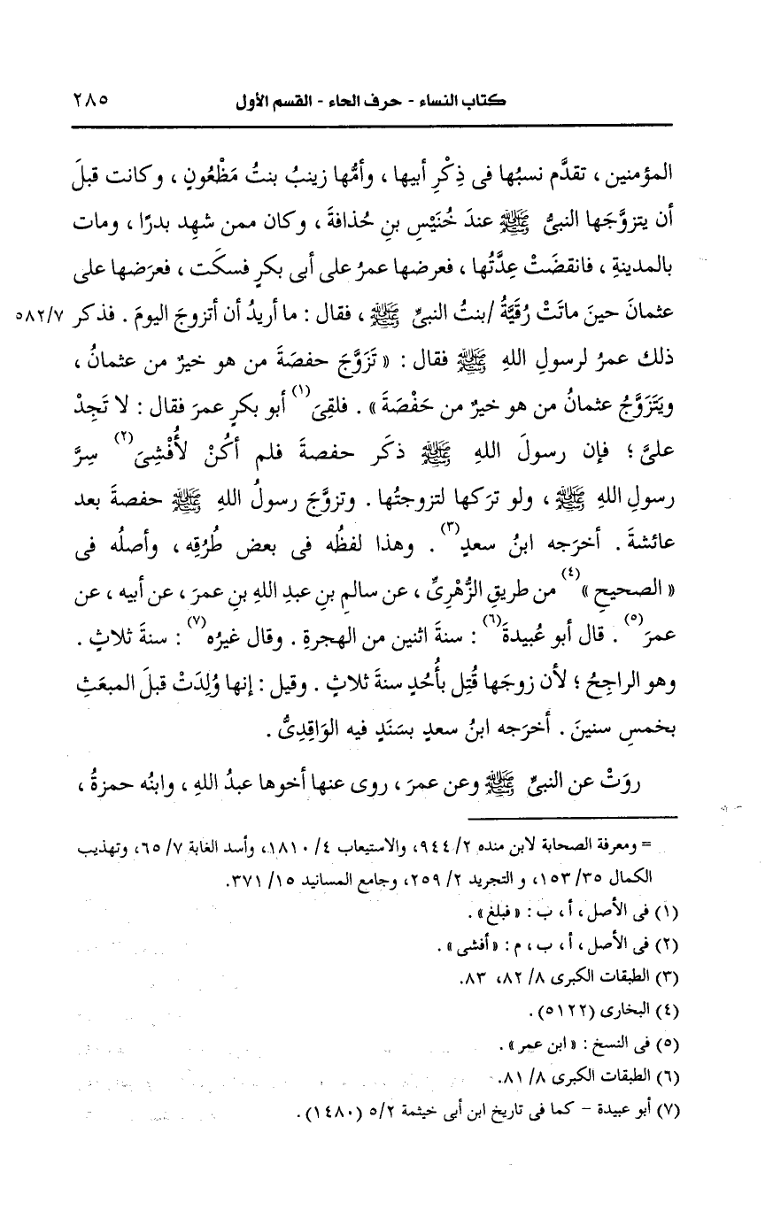 أَخرجه ابن سعد وهذا لفظه في بعض طرقه وأصله في الصحيح من طريق الزُّهْرِيّ، عَن سالم بن عَبد الله بن عمر، عَن أَبيه، عَن ابن عمر قال أَبو عبيدة سنة اثنتين من الهجرة وقال غيره: سنة ثلاثا وهو الراجح لأن زوجها قتل بأحد سنة ثلاثا وقيل إنها ولدت قبل المبعث بخمس سنين أَخرجه ابن سَعد بسند فيه الواقدي.