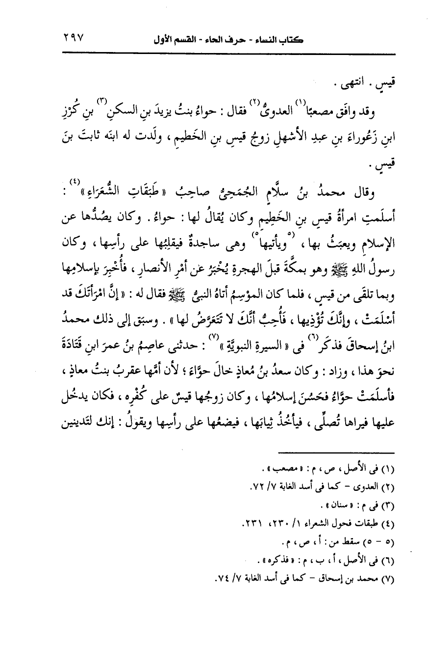 وسبق إلى ذلك محمد بن إسحاق فذكره في السيرة النبوية قال حدثني عاصم بن عمر بن قتادة نحو هذا وزاد، وكان سعد بن معاذ خال حواء لأن أمها عقرب بنت معاذ فأسلمت حواء فحسن إسلامها، وكان زوجها قيس على كفره فكان يدخل عليها فيراها تصلي فيأخذ ثيابها فيضعها على رأسها ويقول إنك لتدنين دينا لا يدري ما هو وذكر أَنَّ النَّبِيَّ صَلى الله عَلَيه وسَلم أوصاه بها نحو ما تقدم فهذا كله يقوى كلام مصعب ويحمل على أن قيسا قتل في تلك السنة فإن الأنصار اجتمعوا بالنَّبِيِّ صَلى الله عَلَيه وسَلم ثلاث مرات بعقبة مني ففي الأولى كانوا قليلا جدا ورجعوا مسلمين يختفون بإسلامهم فأسلم جماعة من أكرمهم خفية ثم في السنة الثانية بايعوا النَّبيّ صَلى الله عَلَيه وسَلم بيعة العقبة وهي الأولى وكانوا اثنى عشر رجلا ورجعوا فانتشر الإسلام وكثر بالمدينة ثم بايعوا البيعة الثانية وهم اثنان وسبعون رجلا وامرأتان فكأن إسلام حواء هذه كان بين الأولى والثانية ووصية قيس في الثانية فقتل بين الثانية والثالثة والله أعلم.