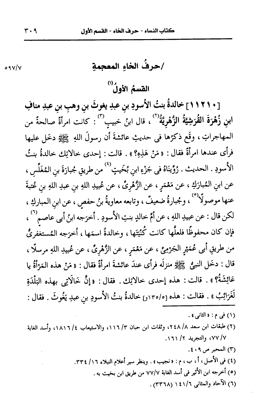 11210- خالدة بنت الأَسود بن عَبد يَغُوث بن وهب بن عبد مناف بن زهرة، القُرشِيّة الزُّهْرِيّة قال ابن حبيب كانت امرأة صالحة من المهاجرات ووقع ذكرها في حديث عائشة أن رسول الله صَلى الله عَلَيه وسَلم دخل عليها فرأى عندها امرأة، فقال: من هذه قالت إحدى خالاتك خالدة بنت الأَسود الحديث رويناه في جزء بن نجيب من طريق جبارة بن المغلس، عَن ابن المبارك، عَن معمر، عَن الزُّهْرِيّ، عَن عبيد الله بن عَبد الله بن عتبة عنها موصولا وجبارة ضعيف وتابعه معاوية بن حفص، عَن ابن المبارك لكن قال، عَن عبيد الله، عَن أُم خالد بنت الأَسود أَخرجه ابن أبي عاصم فإن كان محفوظا فلعلها كانت كنيتها وخالدة اسمها أَخرجه المستغفري من طريق أبي عمير الجرمي، عَن معمر، عَن الزُّهْرِيّ، عَن عبيد الله مُرْسَلاً قال دخل النَّبيّ صَلى الله عَلَيه وسَلم منزله فرأى عند عائشة امرأة، فقال: من هذه المرأة يا عائشة قالت هذه إحدى خالاتك فقال إن خالاتي بهذه البلدة لغرائب فقالت هذه خالدة بنت الأَسود بن عَبد يَغُوث فقال سبحان الله الذي يخرج الحي من الميت فرآها مثقلة.