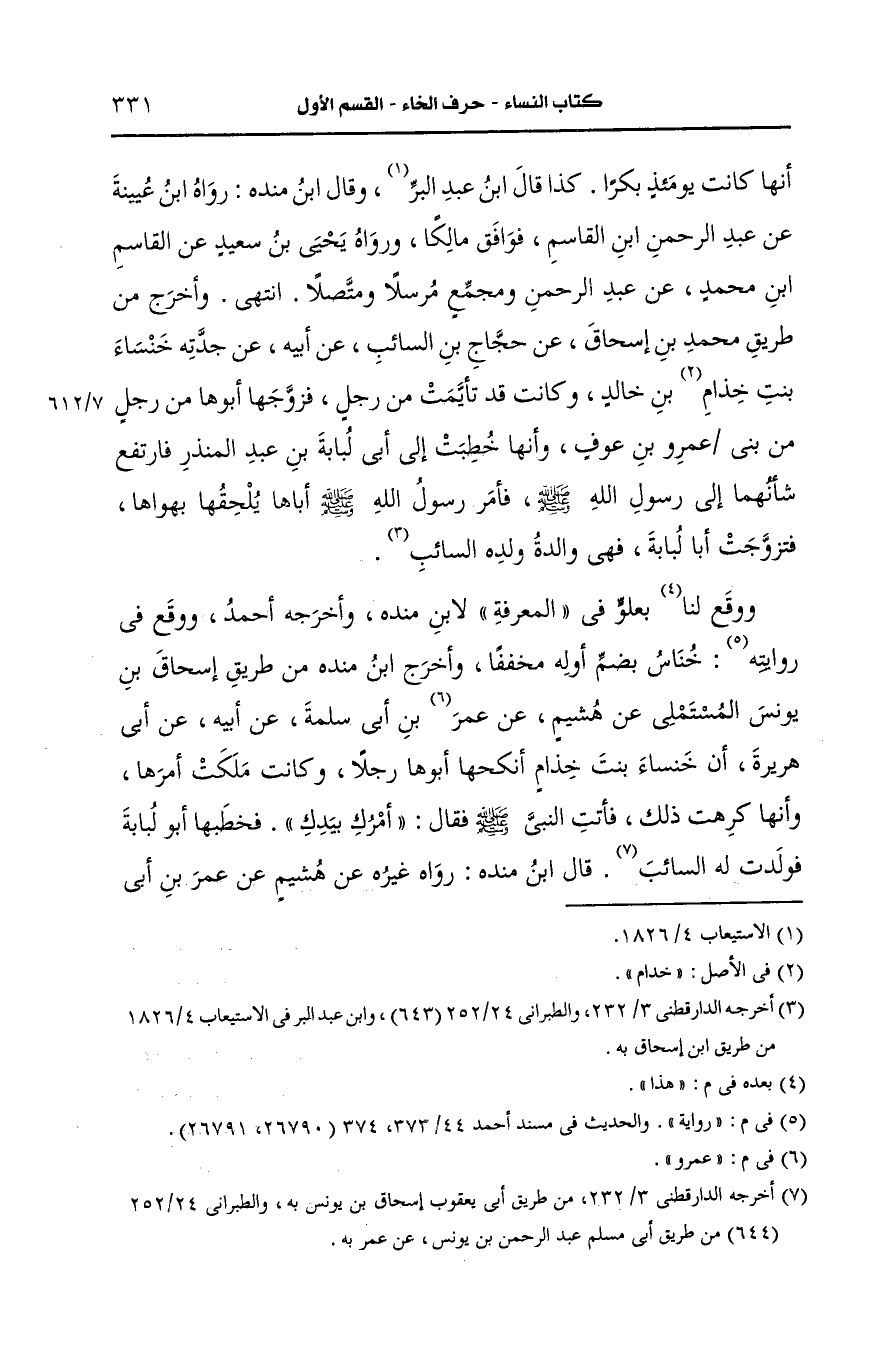 وأخرج ابن مَنْدَه من طريق إسحاق بن يونس المستملي، عَن هشيم، عَن عَمرو بن أبي سلمة، عَن أَبيه، عَن أبي هريرة أن خنساء بنت خذام أنكحها أبوها رجلا وكانت ملكت أمرها وأنها كرهت ذلك فأتت النَّبيّ صَلى الله عَلَيه وسَلم فقال أمرك بيدك فخطبها أَبو لبابة فولدت له السائب.