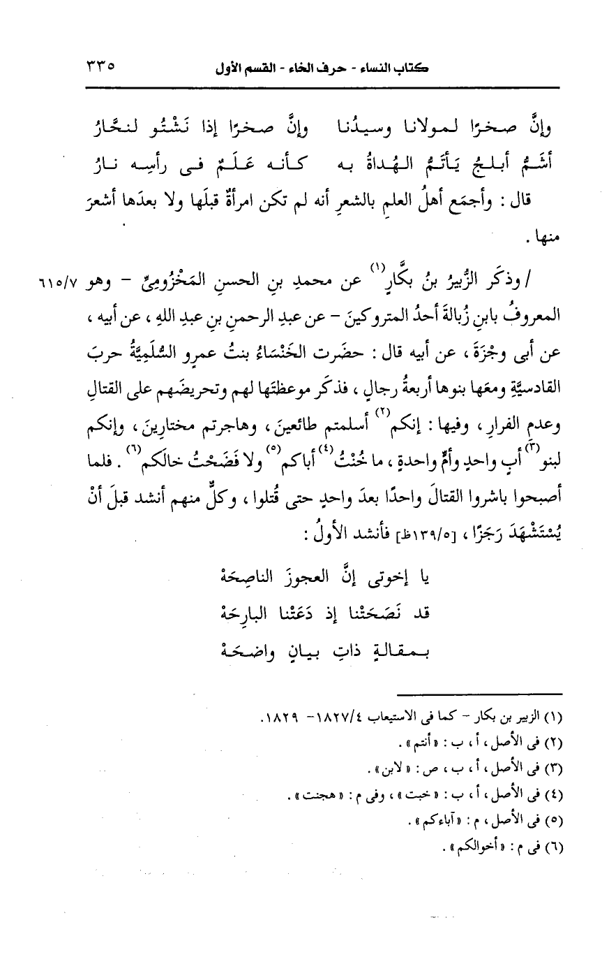 وذكر الزبير بن بكار، عَن محمد بن الحسن المخزومي وهو المعروف بابن زبالة أحد المتروكين، عَن عبد الرحمن بن عَبد الله، عَن أَبيه، عَن أبي وجزة، عَن أَبيه قال حضرت الخنساء بنت عَمرو السلمية حرب القادسية ومعها بنوها أربعة رجال فذكر موعظتها لهم وتحريضهم على القتال وعدم الفرار وفيها إنكم أسلمتم طائعين وهاجرتم مختارين وإنكم لبنوا أب واحد وأم واحدة ما هجنت آباءكم ولا فضحت أخوالكم فلما أصبحوا باشروا القتال واحدا بعد واحد حتى قتلوا، وكان منهم أنشد قبل أن يستشهد رجزا فأنشد الأول: