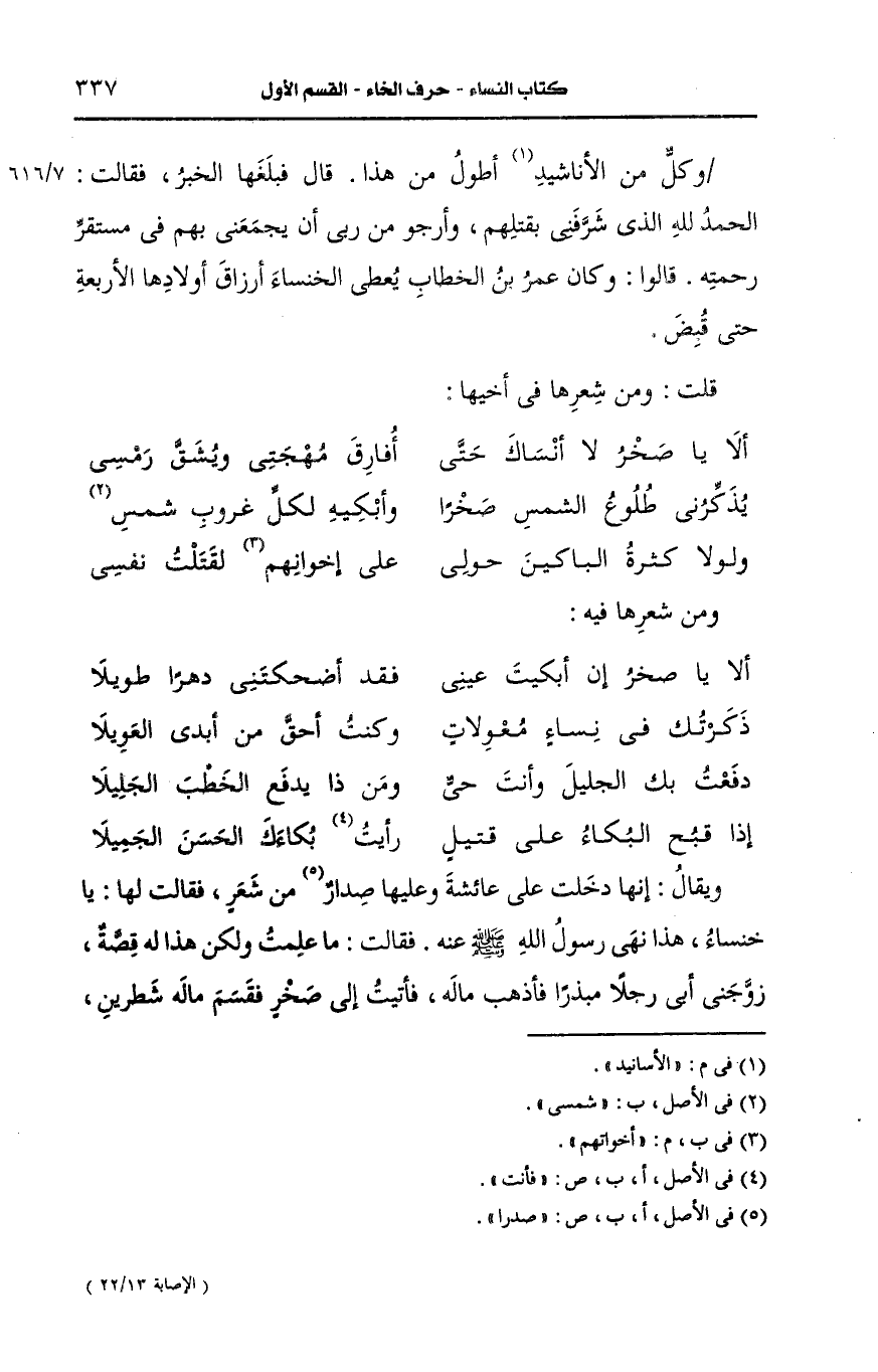 ويُقال: إنها دخلت على عائشة وعليها صدار من شعر فقالت لها يا خنساء هذا نهى رسول الله صَلى الله عَلَيه وسَلم عنه فقالت ما علمت ولكن هذا له قصة زوجني أبي رجلا مبذرا فأذهب ماله فأتيت إلى صخر فقسم ماله شطرين فأعطاني شطرا خيارا ثم فعل زوجي ذلك مرة أخرى فقسم أخي ماله شطرين فأعطاني خيرهما فقالت له امرأته أما ترضي أن تعطيها النصف حتى تعطيها الخيار فقال: