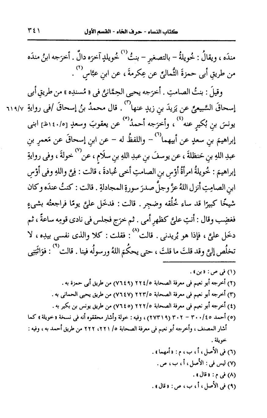 وفي رواية إبراهيم خويلة امرأة أوس بن الصامت أخي عبادة قالت في والله وفي أوس بن الصامت أنزل الله عز وجل صدر سورة المجادلة قالت كنت عنده، وكان شيخا