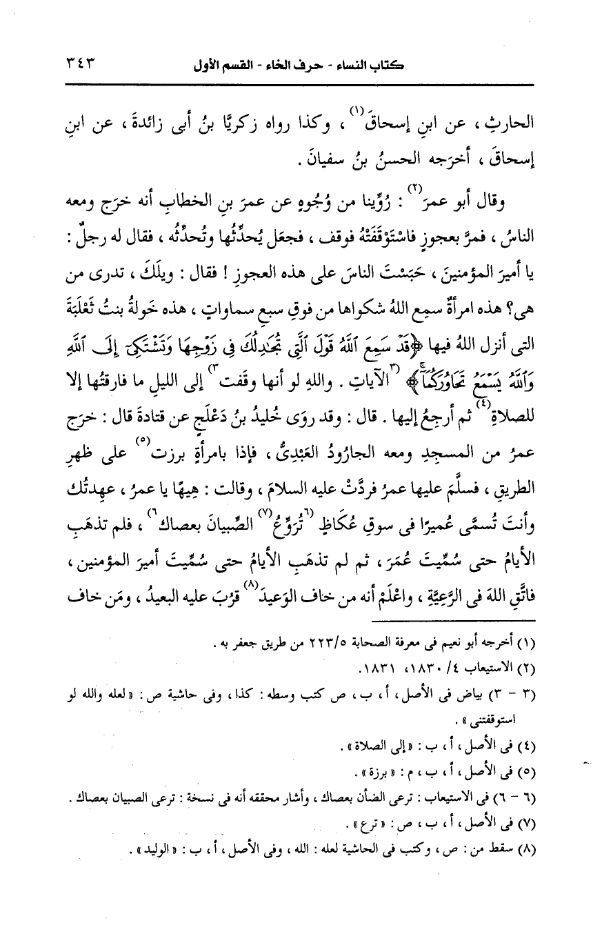 وقال أَبو عُمَر روينا من وجوه، عَن عمر بن الخطاب أنه خرج ومعه الناس فمر بعجوز فاستوقفته فوقف فجعل يحدثها وتحدثه فقال له رجل يا أمير المؤمنين حبست الناس على هذه العجوز فقال ويلك أتدري من هي هذه امرأة سمع الله شكواها من فوق سبع سماوات هذه خولة بنت ثعلبة التي أنزل الله فيها قد سمع الله قول التي تجادلك في زوجها وتشتكي إلى الله والله يسمع تحاوركما ...الآيات والله لو أنها وقفت إلى الليل ما فارقتها إلا للصلاة ثم أرجع إليها.