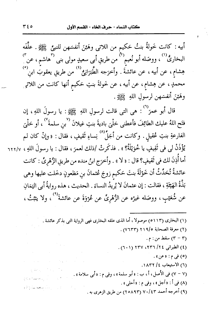 وأخرج ابن مندة من طريق الزُّهْرِيّ كانت عائشة تحدث أن خولة بنت حكيم زوج عثمان بن مظعون دخلت عليها وهي بذة الهيئة فقالت إن عثمان لا يريد النساء الحديث هذه رواية أبي اليمان، عَن شعيب ووصله غيره، عَن الزُّهْرِيّ، عَن عُروَة، عَن عائشة ولا يثبت ولكن أَخرجه أَحمد من طريق ابن إِسحَاق، عَن هشام بن عُروَة، عَن أَبيه، عَن عائشة قالت دخلت علي خويلة بنت حكيم بن أُمَيَّة بن حارثة بن الأوقص السلمية فقال النَّبيّ صَلى الله عَلَيه وسَلم ما أبذ هيئة خويلة فقلت امرأة لا زوج لها تصوم النهار وتقوم الليل فهي طمرور لا زوج لها الحديث. في إنكاره على عثمان.