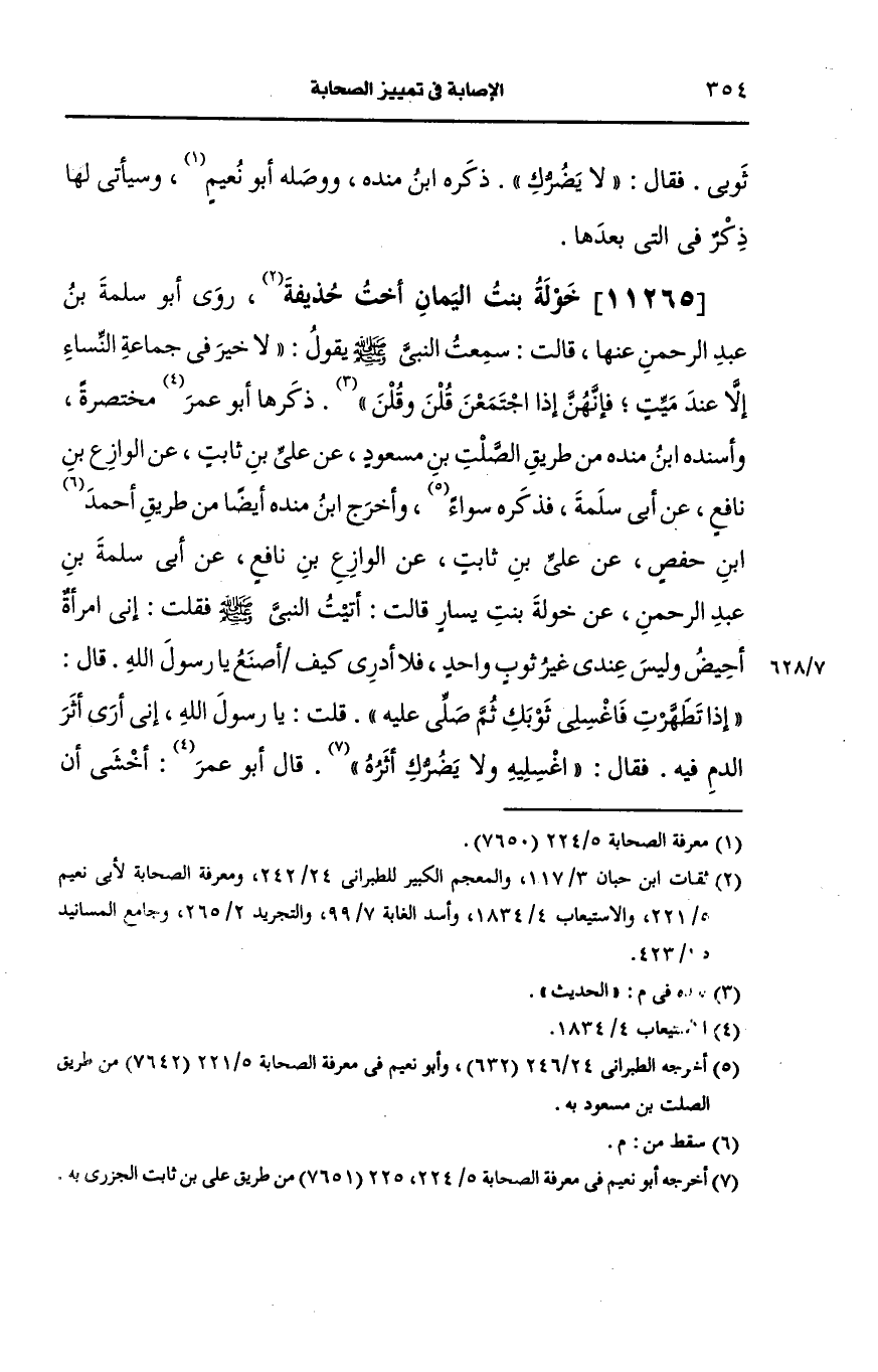 وأخرج ابن مندة أيضًا من طريق ابن حفص، عَن علي بن ثابت، عَن الوازع بن نافع، عَن أبي سلمة بن عبد الرحمن، عَن خولة بنت يسار قالت أتيت النَّبيّ صَلى الله عَلَيه وسَلم فقلت إني امرأة أحيض وليس عندي غير ثوب واحد فلا أدري كيف أصنع يا رسول الله قال: إذا تطهرت فاغسلي ثوبك ثم صلي عليه قلت: يا رسول الله إني أرى أثر الدم فيه فقال اغسليه ولايضرك أثره.
