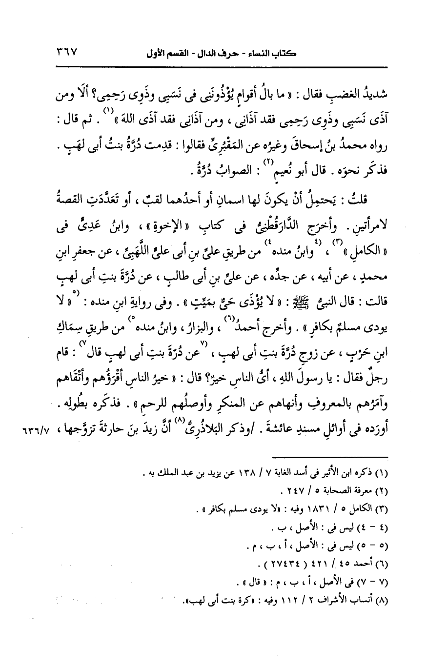 وأخرج الدارقطني في كتاب الإخوة، وابن عدي في الكامل، وابن مَنْدَه من طريق علي بن أبي علي اللهبي، عَن جعفر بن محمد، عَن أَبيه، عَن جَدِّه، عَن علي بن أبي طالب، عَن درة بنت أبي لهب قالت قال النَّبيّ صَلى الله عَلَيه وسَلم لا يؤذي حيي بميت.