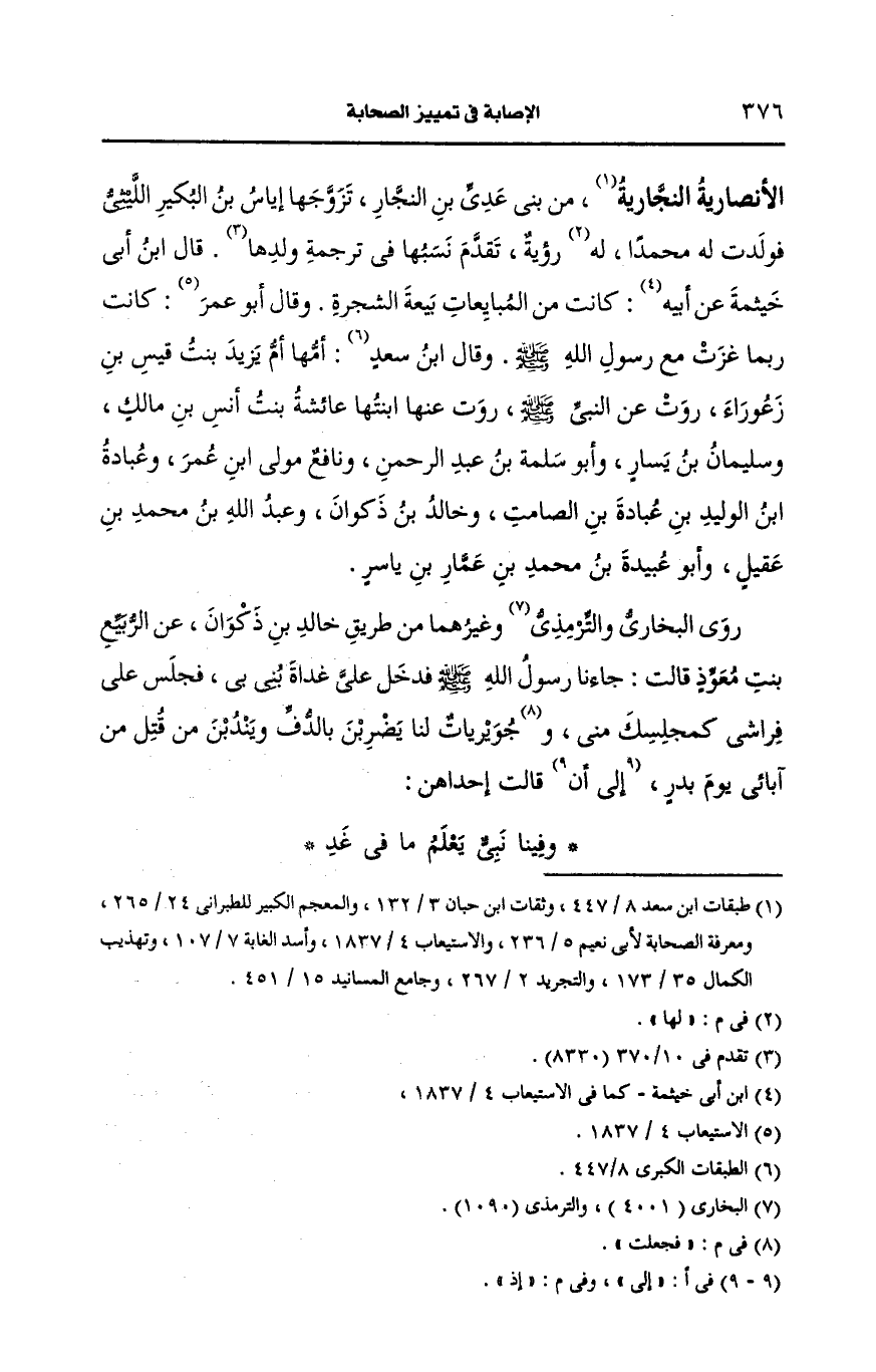 روى البُخارِيّ والتِّرمِذيّ وغيرهما من طريق خالد بن ذكوان، عَن الربيع بنت معوذ قالت جاء النَّبيّ صَلى الله عَلَيه وسَلم فدخل علي غداة بني بي فجلس على فراشي كمجلسك مني فجعلت جويريات لنا يضربن بالدف ويندبن من قتل من آبائي يوم بدر إذ قالت إحداهن وفينا نبي يعلم ما في غد.