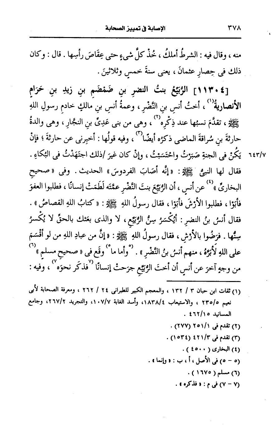 وأما ما وقع في صحيح مسلم من وجه آخر، عَن أنس أن أخت الربيع جرحت إنسانا فذكره وفيه فقالت أم الربيع يا رسول الله أيقتص من فلانة فتلك قصة أخرى إن كان الراوي حفظ وإلا فهو وَهْمٌ من بعض رواته ويستفاد إن كان محفوظا أن لوالدة الربيع صحبة ولأنس عنها رواية في صحيح مسلم في قصة قتل أخيها أنس بن النضر لما استشهد بأحد قال أنس فقالت أخته الربيع عمتي بنت النضر ما عرفت إلا أخي ببنانه وهذا صريح من روايته، عَن عمته وقد أخل صاحب الأطراف فلم يترجم للربيع بنت النضر وهو عند البُخارِيّ من وجه آخر، عَن أنس بلفظ ما عرفته إلا أخته.