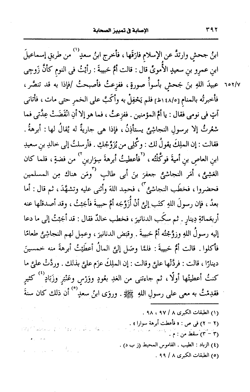 فأخرج ابن سعد من طريق إسماعيل بن عَمرو بن سعيد الأموي قال قالت أم حبيبة رأيت في المنام كأن زوجي عبيد الله بن جحش بأسوأ صورة ففزعت فأصبحت فإذا به قد تنصر فأخبرته بالمنام فلم يحفل به وأكب على الخمر حتى مات فأتاني آت في نومي فقال يا أم المؤمنين ففزعت فما هو إلا أن انقضت عدتي فما شعرت إلا برسول النجاشي يستأذن فإذا هي جارية له، يُقَالُ لَهَا: أبرهة فقالت إن الملك يقول لك وكلي من يزوجك فأرسلت الى خالد بن سعيد بن العاص بن أُمَيَّة فوكلته فأعطيت أبرهة سوارين من فضة فلما كان العشي أمر النجاشي جعفر بن أبي طالب فحمد الله وأثنى عليه وتشهد ثم قال أما بعد فإن رسول الله صَلى الله عَلَيه وسَلم كتب الي أن أزوجه أم حبيبة فأجبت وقد أصدقتها عنه أربعمِئَة دينار ثم سكب الدنانير فخطب خالد فقال قد أجبت الى ما دعا اليه رسول الله صَلى الله عَلَيه وسَلم وزوجته أم حبيبة وقبض الدنانير وعمل لهم النجاشي طعاما فأكلوا.