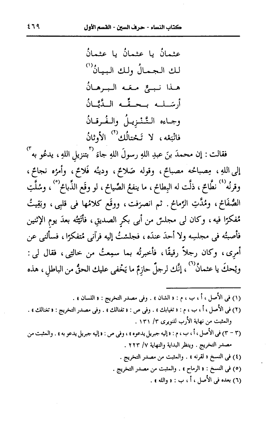 ثم انصرفت ووقع كلامها في قلبي وبقيت مفكرا فيه، وكان لي مجلس من أبي بكر الصديق فأتيته بعد يوم الإثنين فأصبته في مجلسه ولا أحد عنده فجلست إليه فرآني متفكرا فسألني، عَن أمري، وكان رجلا رقيقا فأخبرته بما سمعت من خالتي فقال لي ويحك يا عثمان والله إنك لرجل حازم ما يخفى عليك الحق من الباطل هذه الأوثان التي يعبدها قومك أليست حجارة صما لا تسمع ولا تبصر ولا تضر ولا تنفع قلت: بلى والله إنها لكذلك قال والله لقد صدقتك خالتك هذا محمد بن عَبد الله قد بعثه الله برسالته إلى جميع خلقه فهل لك أن تأتيه وتسمع منه فقلت نعم فوالله ما كان بأسرع من أن مر رسول الله صَلى الله عَلَيه وسَلم ومعه علي بن أبي طالب يحمل ثوبا لرسول الله صَلى الله عَلَيه وسَلم فلما رآه أَبو بكر قام إليه فساره في أذنه فجاء رسول الله صَلى الله عَلَيه وسَلم فقعد ثم أقبل علي فقال يا عثمان أجب الله إلى جنته فإني رسول الله إليك وإلى جميع خلقه قال فوالله ما تمالكت حين سمعت قوله أن أسلمت وشهدت أن لا إله إلا الله وحده لا شريك له وأن محمدا عبده ورسوله ثم لم ألبث أن تزوجت رقية، وكان يقال أحسن زوجين رآهما إنسان رقية وزوجها عثمان وفي إسلام عثمان تقول خالته سعدى: