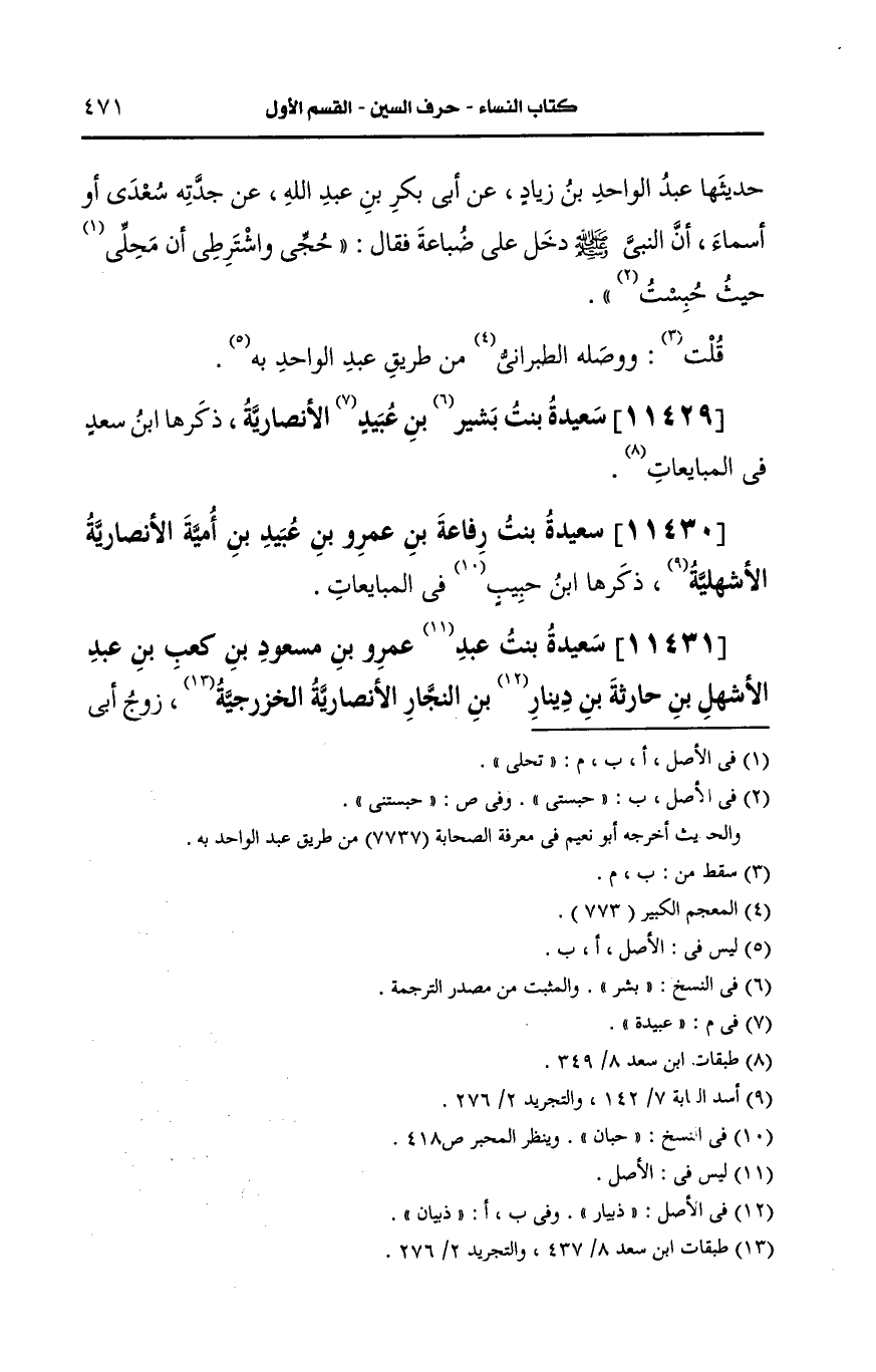 11431- سعيدة بنت عبد عَمرو بن مسعود بن عبد الأشهل بن حارثة بن دينار بن النجار، الأَنصارِيّة الخزرجية.