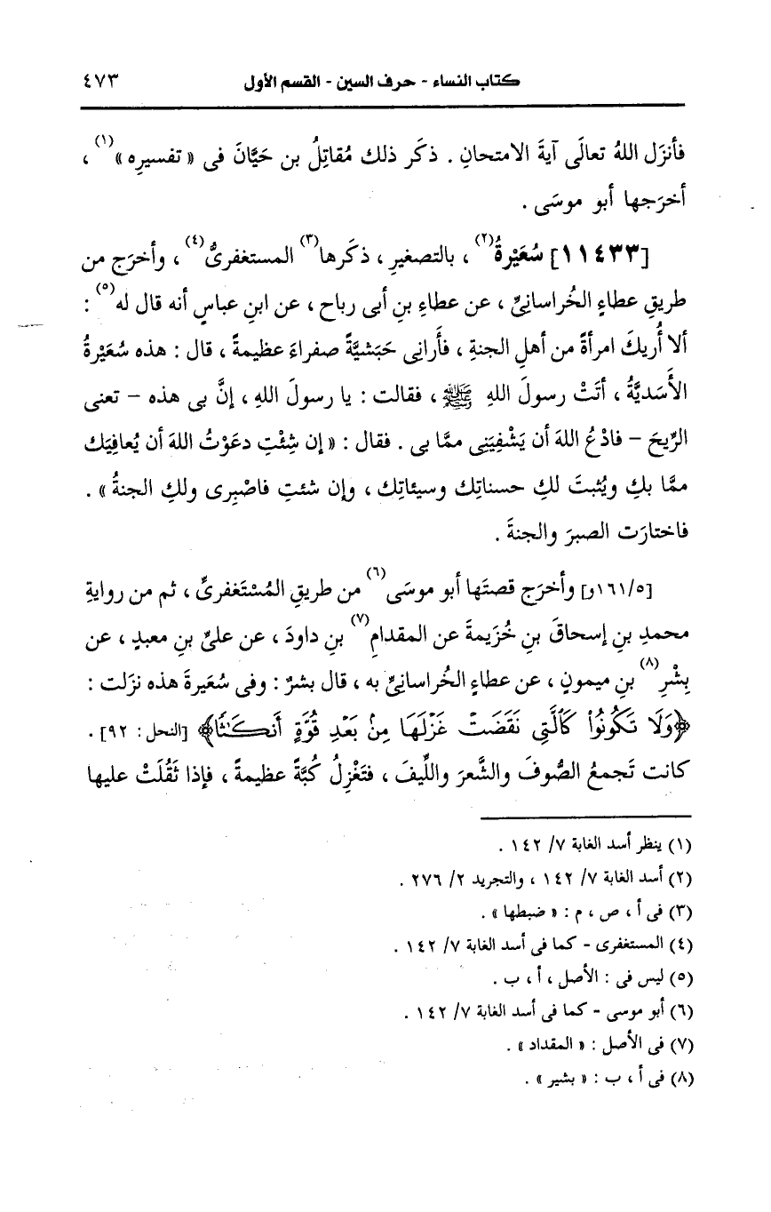 ضبطها المستغفري وأخرج من طريق عطاء الخراساني، عَن عطاء بن أبي رباح، عَن ابن عباس أنه قال له ألا أريك امرأة من أهل الجنة فأراني حبشية صفراء عظيمة قال هذه سعيرة الأسدية أتت رسول الله صَلى الله عَلَيه وسَلم فقالت يا رسول الله إن بي هذه تعني الريح فادع الله أن يشفيني مما بي فقال إن شئت دعوت الله أن يعافيك مما بك ويثبت لك حسناتك وسيئاتك وإن شئت فاصبري ولك الجنة فاختارت الصبر والجنة.