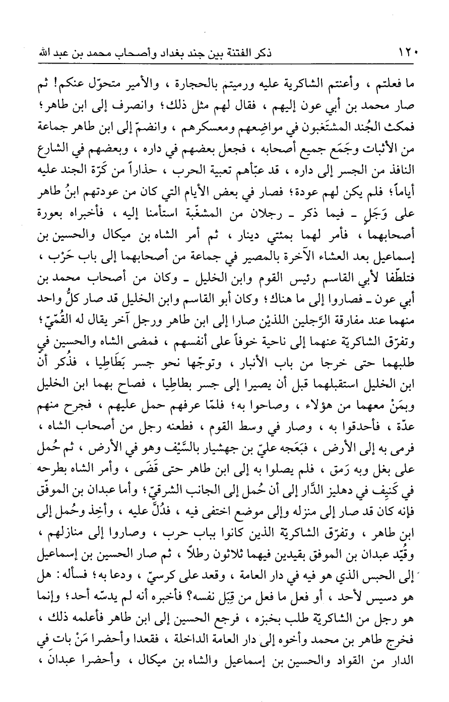 ما فعلتم، وأعنتم الشاكرية عليه ورميتم بالحجارة، والأمير متحوّل عنكم! ثم صار محمد بن أبي عون إليهم، فقال لهم مثل ذلك؛ وانصرف إلى ابن طاهر؛ فمكث الجُند المشتَغبون في مواضِعهم ومعسكرهم، وانضمّ إلى ابن طاهر جماعة من الأثبات وجَمَع جميع أصحابه، فجعل بعضهم في داره، وبعضهم في الشارع النافذ من الجسر إلى داره، قد عبّأهم تعبية الحرب، حذارًا من كَرّة الجند عليه أيامًا؛ فلم يكن لهم عودة؛ فصار في بعض الأيام التي كان من عودتهم ابنُ طاهر على وَجَلٍ - فيما ذكر - رجلان من المشغّبة استأمنا إليه، فأخبراه بعورة أصحابهما، فأمر لهما بمئتي دينار، ثم أمر الشاه بن ميكال والحسين بن إسماعيل بعد العشاء الآخرة بالمصير في جماعة من أصحابهما إلى باب حَرْب، فتلطَّفا لأبي القاسم رئيس القوم وابن الخليل - وكان من أصحاب محمد بن أبي عون - فصاروا إلى ما هناك؛ وكان أبو القاسم وابن الخليل قد صار كلُّ واحد منهما عند مفارقة الرَّجلين اللذيْن صارا إلى ابن طاهر ورجل آخر يقال له القُمّيّ؛ وتفرَّق الشاكريّة عنهما إلى ناحية خوفًا على أنفسهم، فمضى الشاه والحسين في طلبهما حتى خرجا من باب الأنبار، وتوجّها نحو جسر بَطَاطِيا، فذُكر أن ابن الخليل استقبلهما قبل أن يصيرا إلى جسر بطاطِيا، فصاح بهما ابن الخليل وبمَنْ معهما من هؤلاء، وصاحوا به؛ فلمَّا عرفهم حمل عليهم، فجرح منهم عدّة، فأحدقوا به، وصار في وسط القوم، فطعنه رجل من أصحاب الشاه، فرمى به إلى الأرض، فبَعَجه عليّ بن جهشيار بالسَّيْف وهو في الأرض، ثم حُمل على بغل وبه رَمق، فلم يصلوا به إلى ابن طاهر حتى قَضَى، وأمر الشاه بطرحه في كَنيِف في دهليز الدَّار إلى أن حُمل إلى الجانب الشرقيّ؛ وأما عبدان بن الموفّق فإنه كان قد صار إلى منزله وإلى موضع اختفى فيه، فدُلَّ عليه، وأخِذ وحُمل إلى ابن طاهر، وتفرّق الشاكريّة الذين كانوا بباب حرب، وصاروا إلى منازلهم، وقُيَّد عبدان بن الموفق بقيدين فيهما ثلاثون رطلًا، ثم صار الحسين بن إسماعيل إلى الحبس الذي هو فيه في دار العامة، وقعد على كرسيّ، ودعا به؛ فسأله: هل هو دسيس لأحد، أو فعل ما فعل من قِبَل نفسه؟ فأخبره أنه لم يدسّه أحد؛ وإنما هو رجل من الشاكريّة طلب بخبزه، فرجع الحسين إلى ابن طاهر فأعلمه ذلك، فخرج طاهر بن محمد وأخوه إلى دار العامة الداخلة، فقعدا وأحضرا مَنْ بات في الدار من القواد والحسين بن إسماعيل والشاه بن ميكال، وأحضرا عبدانَ،