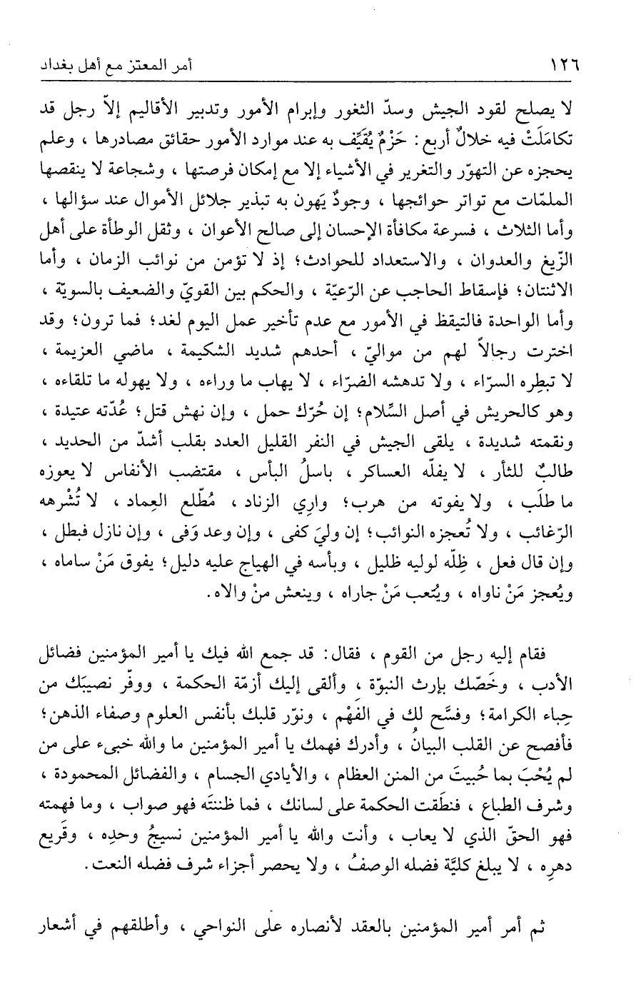 لا يصلح لقود الجيش وسدّ الثغور وإبرام الأمور وتدبير الأقاليم إلَّا رجل قد تكامَلَتْ فيه خلالٌ أربع: حَزْمٌ يُقَيِّف به عند موارد الأمور حقائق مصادرها، وعلم يحجزه عن التهوّر والتغرير في الأشياء إلَّا مع إمكان فرصتها، وشجاعة لا ينقصها الملمّات مع تواتر حوائجها، وجودٌ يَهون به تبذير جلائل الأموال عند سؤالها، وأما الثلاث، فسرعة مكافأة الإحسان إلى صالح الأعوان، وثقل الوطأة على أهل الزّيغ والعدوان، والاستعداد للحوادث؛ إذ لا تؤمن من نوائب الزمان، وأما الاثنتان؛ فإسقاط الحاجب عن الرّعيّة، والحكم بين القويّ والضعيف بالسويّة، وأما الواحدة فالتيقظ في الأمور مع عدم تأخير عمل اليوم لغد؛ فما ترون؛ وقد اخترت رجالًا لهم من مواليّ، أحدهم شديد الشكيمة، ماضي العزيمة، لا تبطِره السرّاء، ولا تدهشه الضرّاء، لا يهاب ما وراءه، ولا يهوله ما تلقاءه، وهو كالحريش في أصل السِّلام؛ إن حُرّك حمل، وإن نهش قتل؛ عُدّته عتيدة، ونقمته شديدة، يلقى الجيش في النفر القليل العدد بقلب أشدّ من الحديد، طالبٌ للثأر، لا يفلّه العساكر، باسلُ البأس، مقتضب الأنفاس لا يعوزه ما طلَب، ولا يفوته من هرب؛ وارِي الزناد، مُطّلع العِماد، لا تُشْرهه الرّغائب، ولا تُعجزه النوائب؛ إن وليَ كفى، وإن وعد وَفى، وإن نازل فبطل، وإن قال فعل، ظِلّه لوليه ظليل، وبأسه في الهياج عليه دليل؛ يفوق مَنْ ساماه، ويُعجز مَنْ ناواه، ويُتعب مَنْ جاراه، وينعش منْ والاه.