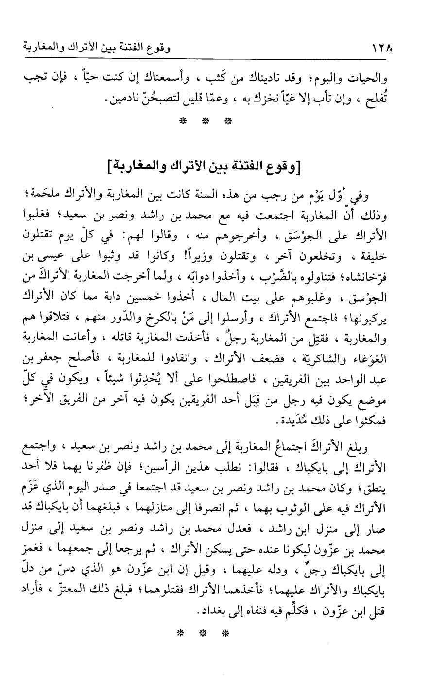 وفي أوّل يَوْم من رجب من هذه السنة كانت بين المغاربة والأتراك ملحَمة؛ وذلك أنّ المغاربة اجتمعت فيه مع محمد بن راشد ونصر بن سعيد؛ فغلبوا الأتراك على الجوْسَق، وأخرجوهم منه، وقالوا لهم: في كلّ يوم تقتلون خليفة، وتخلعون آخر، وتقتلون وزيرًا! وكانوا قد وثبوا على عيسى بن فرّخانشاه؛ فتناولوه بالضَّرْب، وأخذوا دوابّه، ولما أخرجت المغاربة الأتراكَ من الجوْسق، وغلبوهم على بيت المال، أخذوا خمسين دابة مما كان الأتراك يركبونها؛ فاجتمع الأتراك، وأرسلوا إلى مَنْ بالكرخ والدّور منهم، فتلاقوا هم والمغاربة، فقتِل من المغاربة رجلٌ، فأخذت المغاربة قاتله، وأعانت المغاربة الغوْغاء والشاكريّة، فضعف الأتراك، وانقادوا للمغاربة، فأصلح جعفر بن عبد الواحد بين الفريقين، فاصطلحوا على ألا يُحْدِثوا شيئًا، ويكون في كلّ موضع يكون فيه رجل من قِبَل أحد الفريقين يكون فيه آخر من الفريق الآخر؛ فمكثوا على ذلك مُدَيدة.
