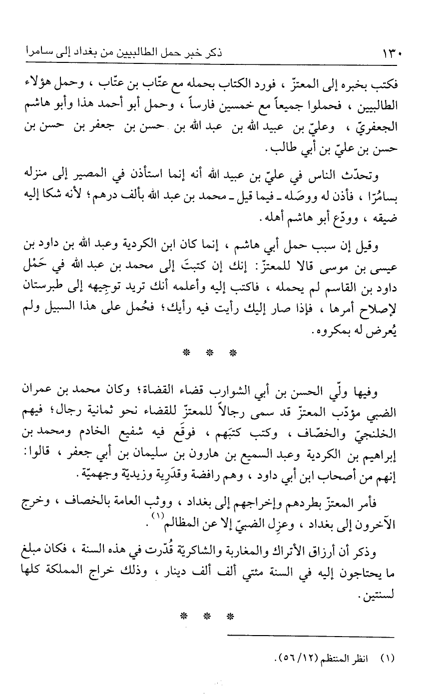 فكتب بخبره إلى المعتزّ، فورد الكتاب بحمله مع عتّاب بن عتّاب، وحمل هؤلاء الطالبيين، فحملوا جميعًا مع خمسين فارسًا، وحمل أبو أحمد هذا وأبو هاشم الجعفريّ، وعليّ بن عبيد الله بن عبد الله بن حسن بن جعفر بن حسن بن حسن بن عليّ بن أبي طالب.