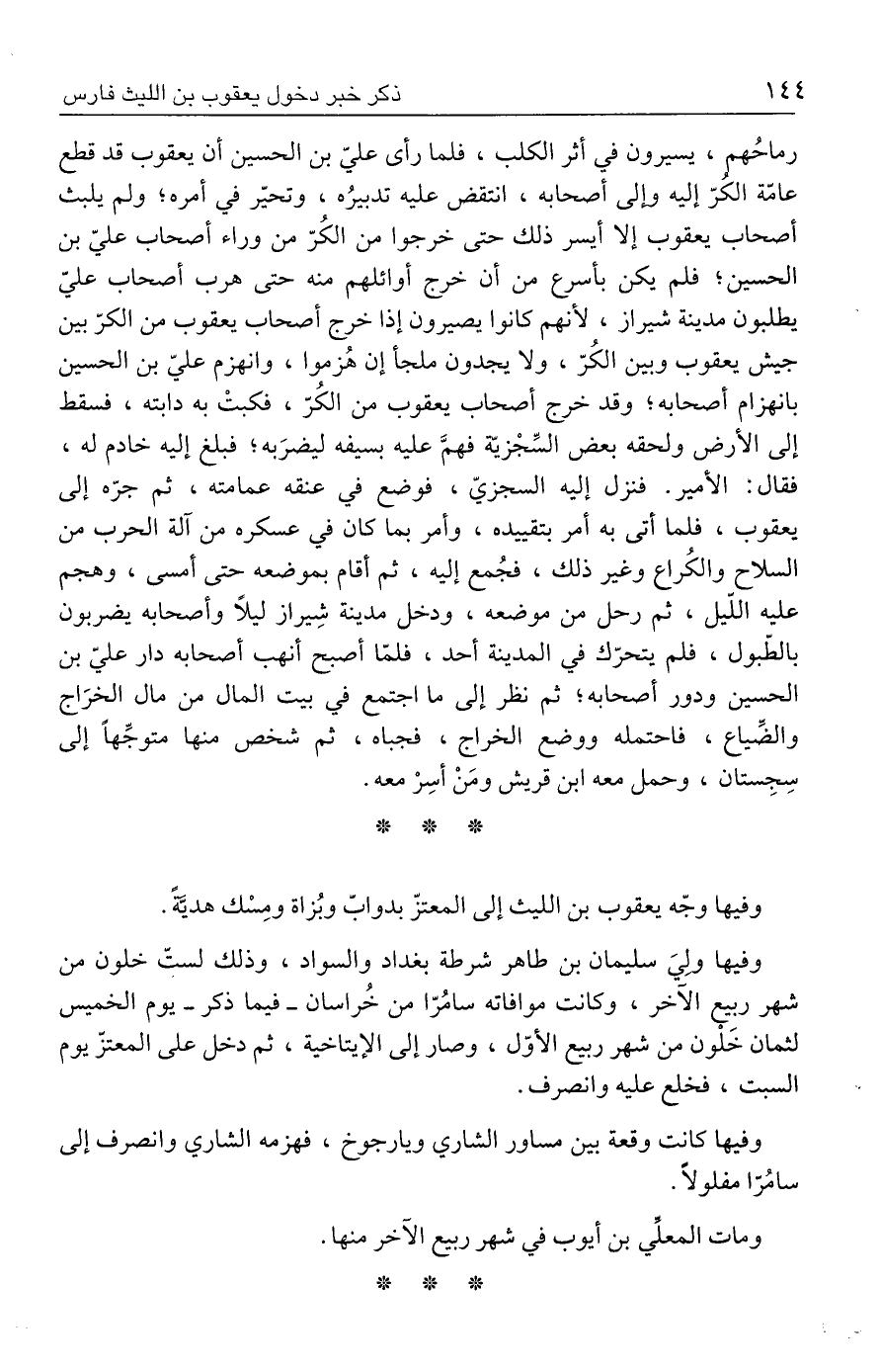 رماحُهم، يسيرون في أثر الكلب، فلما رأى عليّ بن الحسين أن يعقوب قد قطع عاقة الكُرّ إليه وإلى أصحابه، انتقض عليه تدبيرُه، وتحيّر في أمره؛ ولم يلبث أصحاب يعقوب إلَّا أيسر ذلك حتى خرجوا من الكُرّ من وراء أصحاب عليّ بن الحسين؛ فلم يكن بأسرع من أن خرج أوائلهم منه حتى هرب أصحاب عليّ يطلبون مدينة شيراز، لأنهم كانوا يصيرون إذا خرج أصحاب يعقوب من الكرّ بين جيش يعقوب وبين الكُرّ، ولا يجدون ملجأ إن هُزموا، وانهزم عليّ بن الحسين بانهزام أصحابه؛ وقد خرج أصحاب يعقوب من الكُرّ، فكبتْ به دابته، فسقط إلى الأرض ولحقه بعض السِّجْزيّة فهمَّ عليه بسيفه ليضرَبه؛ فبلغ إليه خادم له، فقال: الأمير. فنزل إليه السجزيّ، فوضع في عنقه عمامته، ثم جرّه إلى يعقوب، فلما أتى به أمر بتقييده، وأمر بما كان في عسكره من آلة الحرب من السلاح والكُراع وغير ذلك، فجُمع إليه، ثم أقام بموضعه حتى أمسى، وهجم عليه القيل، ثم رحل من موضعه، ودخل مدينة شِيراز ليلًا وأصحابه يضربون بالطّبول، فلم يتحرّك في المدينة أحد، فلمّا أصبح أنهب أصحابه دار عليّ بن الحسين ودور أصحابه؛ ثم نظر إلى ما اجتمع في بيت المال من مال الخرَاج والضِّياع، فاحتمله ووضع الخراج، فجباه، ثم شخص منها متوجِّهًا إلى سِجِستان، وحمل معه ابن قريش ومَنْ أسِرْ معه.