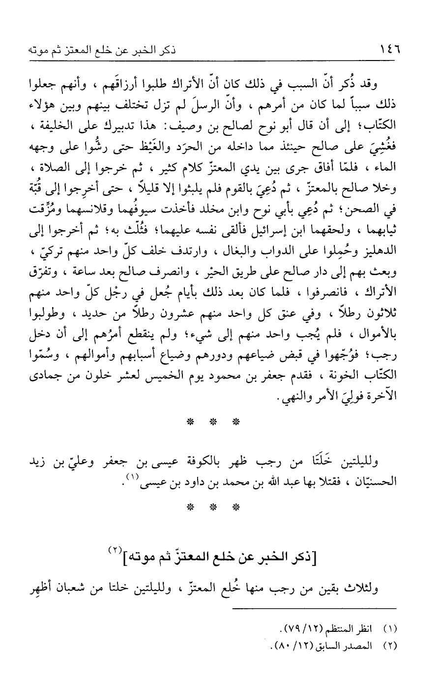 ولثلاث بقين من رجب منها خُلع المعتزّ، ولليلتين خلتا من شعبان أظهِر