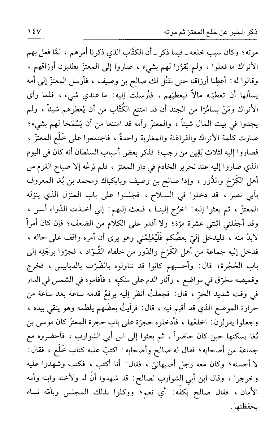 موته؛ وكان سبب خلعه - فيما ذكر - أن الكتَّاب الذي ذكرنا أمرهم، لمَّا فعل بهم الأتراك ما فعلوا، ولم يُقرُّوا لهم بشيء، صاروا إلى المعتزّ يطلبون أرزاقهم، وقالوا له: أعطِنا أرزاقنا حتى نقتُل لك صالح بن وصيف، فأرسل المعتزّ إلى أمه يسألها أن تعطيَه مالًا ليعطيَهم، فأرسلت إليه: ما عندي شيء، فلما رأى الأتراك ومَنْ بسامُرّا من الجند أن قد امتنع الكُتَّاب من أن يُعطوهم شيئًا، ولم يجدوا في بيت المال شيئًا، والمعتزّ وأمه قد امتنعا من أن يَسْمَحا لهم بشيء؛ صارت كلمة الأتراك والفراغنة والمغاربة واحدةً، فاجتمعوا على خَلْع المعتزّ، فصاروا إليه لثلاث بَقِين من رجب؛ فذكر بعض أسباب السلطان أنه كان في اليوم الذي صاروا إليه عند نحرير الخادم في دار المعتز، فلم يَرعْه إلا صياح القوم من أهل الكَرْخ والدُّور، وإذا صالح بن وصيف وبايكباك ومحمد بن بُغا المعروف بأبي نصر، قد دخلوا في السلاح، فجلسوا على باب المنزل الذي ينزله المعتزّ، ثم بعثوا إليه: اخرُج إلينا، فبعث إليهم: إني أخذت الدّواء أمس، وقد أجفلني اثنتي عشرة مرّة؛ ولا أقدر على الكلام من الضعف؛ فإن كان أمرًا لابدّ منه، فليدخل إليّ بعضُكم فَلْيُعْلِمْني وهو يرى أن أمره واقف على حاله، فدخل إليه جماعة من أهل الكَرْخ والدّور من خلفاء القُوّاد، فجرّوا برجْلِه إلى باب الحُجْرة؛ قال: وأحسبهم كانوا قد تناولوه بالضّرْب بالدبابيس، فخرج وقميصه مخرّق في مواضح، وآثار الدم على منكبِه، فأقاموه في الشمس في الدار في وقت شديد الحرّ، قال: فجعلتُ أنظر إليه يرفعُ قدمه ساعة بعد ساعة من حرارة الموضع الذي قد أقيم فيه، قال: فرأيتُ بعضهم يلطمه وهو يتقي بيده، وجعلوا يقولون: اخلعْها، فأدخلوه حجرَة على باب حجرة المعتزّ كان موسى بن بُغا يسكنها حين كان حاضرًا، ثم بعثوا إلى ابن أبي الشوارب، فأحضروه مع جماعة من أصحابه؛ فقال له صالح وأصحابه: اكتبْ عليه كتاب خَلْع، فقال: لا أحسنه؛ وكان معه رجل أصبهانيّ، فقال: أنا أكتب، فكتب وشهدوا عليه وخرجوا، وقال ابن أبي الشوارب لصالح: قد شهدوا أنّ له ولأخته وابنه وأمه الأمان، فقال صالح بكفّه: أي نعم؛ ووكلوا بذلك المجلس وبأمّه نساء يحفظنها.